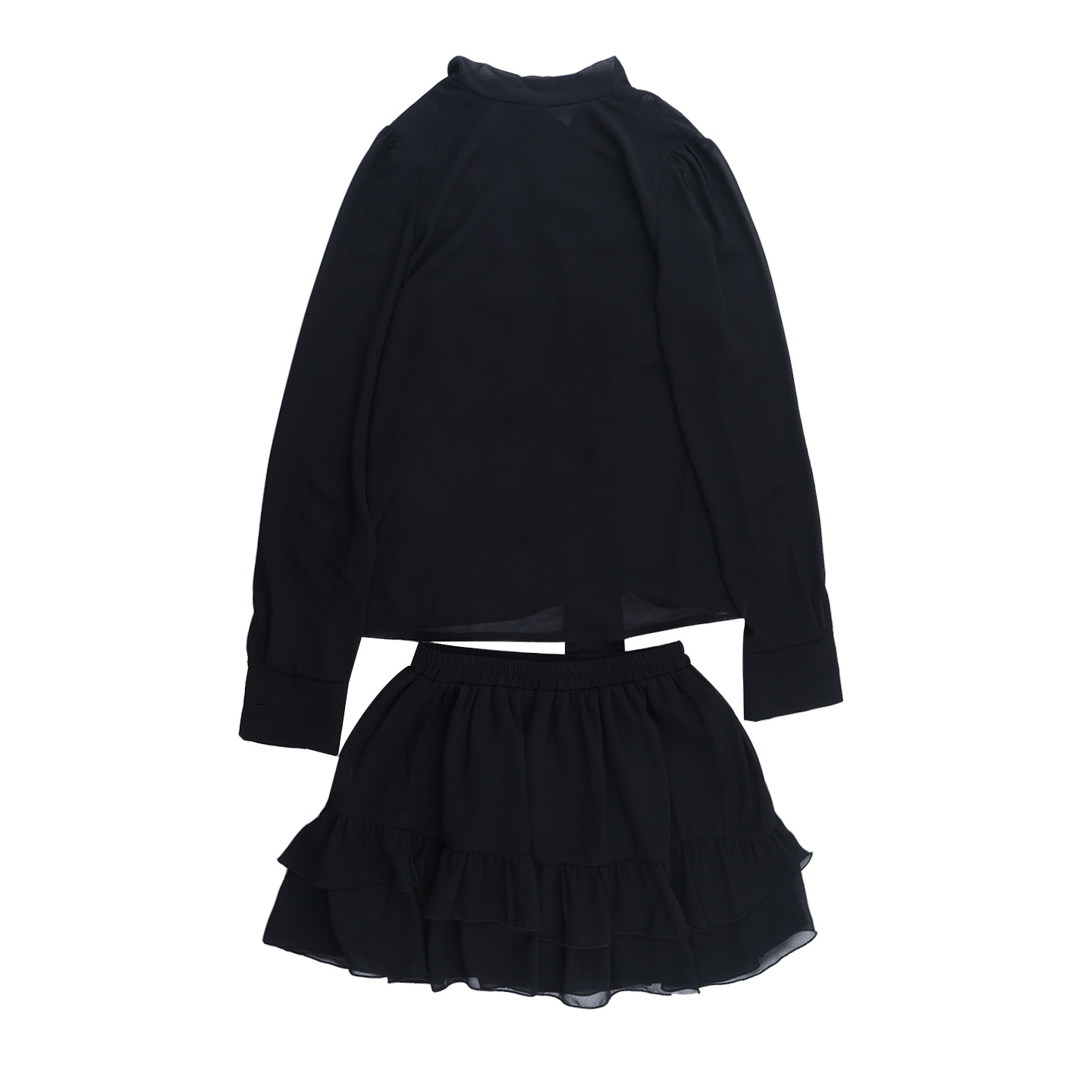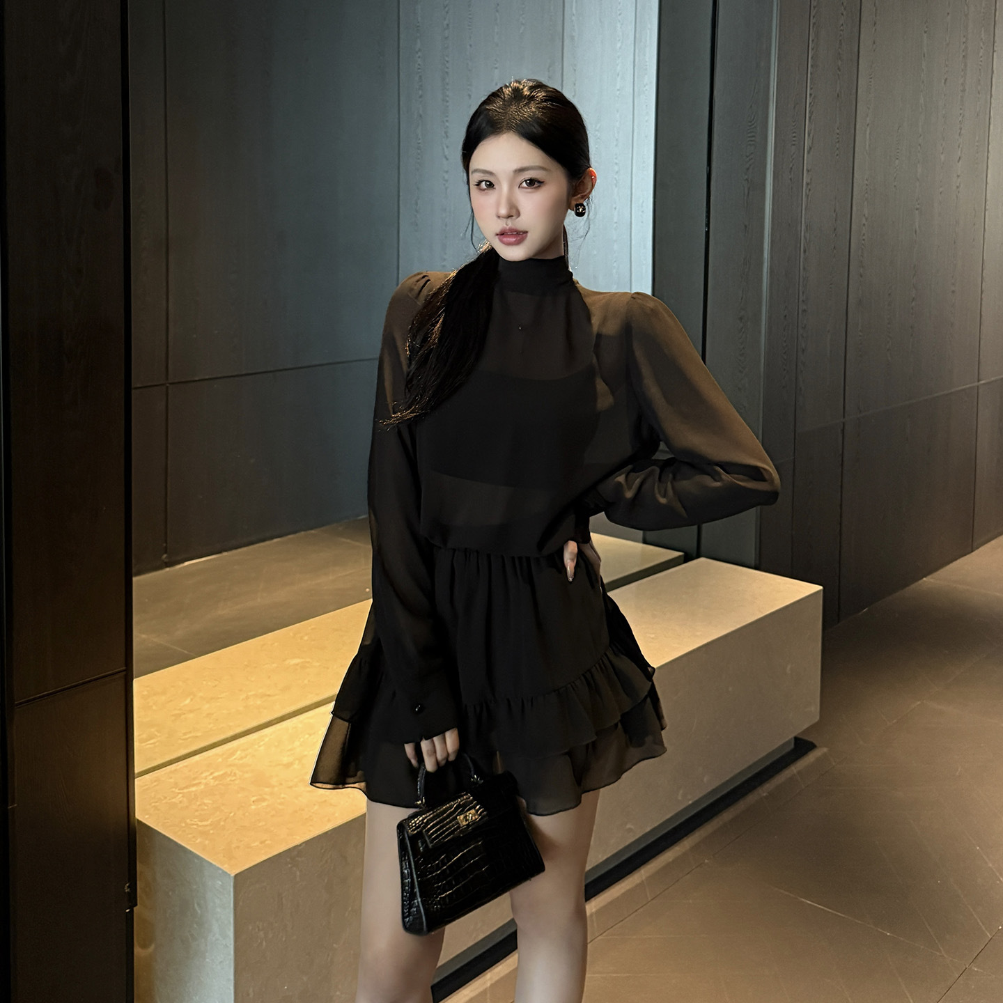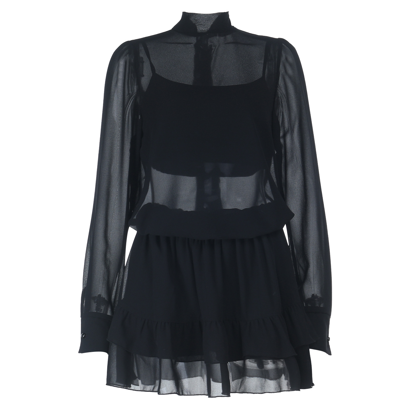 The Chiffon Half High Collar Perspective Set is the epitome of daring elegance. Its unique design elements—the half high collar, sheer fabric, and extra-long sleeves—make it a truly unforgettable ensemble. Slip into this black nylon set and embrace your inner fashion royalty.