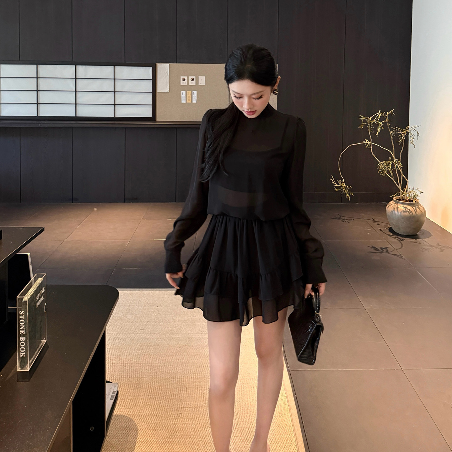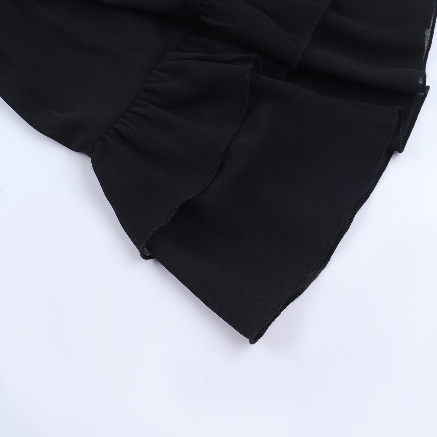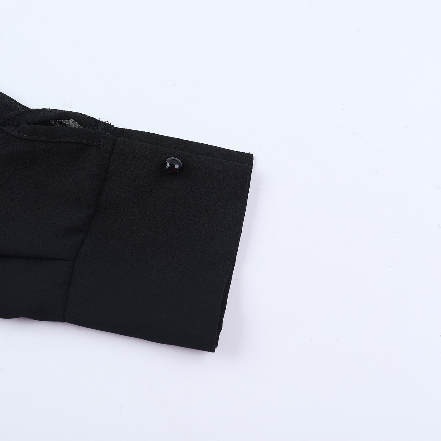 The Chiffon Half High Collar Perspective Set is the epitome of daring elegance. Its unique design elements—the half high collar, sheer fabric, and extra-long sleeves—make it a truly unforgettable ensemble. Slip into this black nylon set and embrace your inner fashion royalty.
