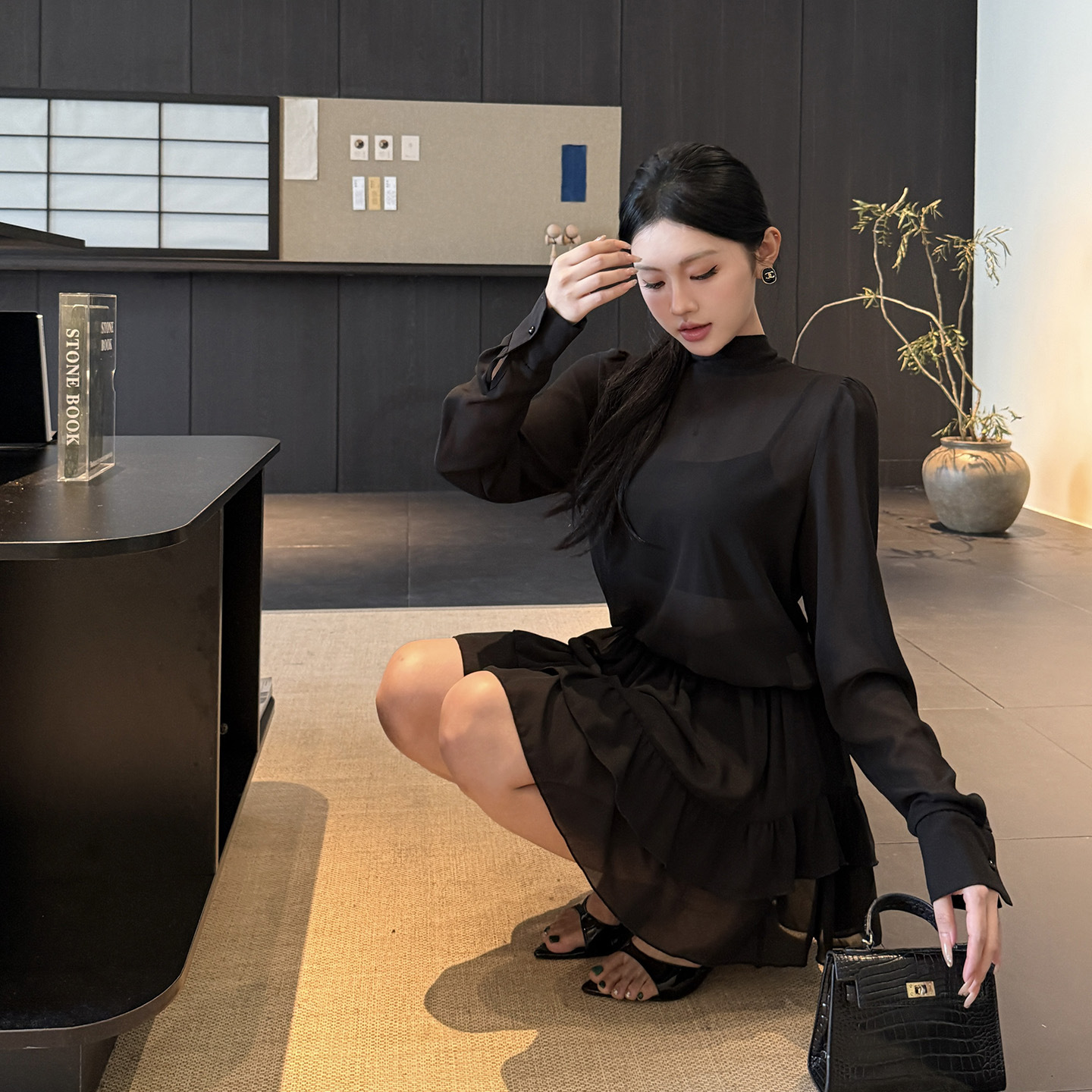 Emphasize the commanding "Queen Style" with strategic, powerful accessories. Since the fabric is sheer and the color is black, opt for dark, edgy metals or minimalist jewelry. The high collar negates the need for a necklace; focus attention on the hands and footwear.