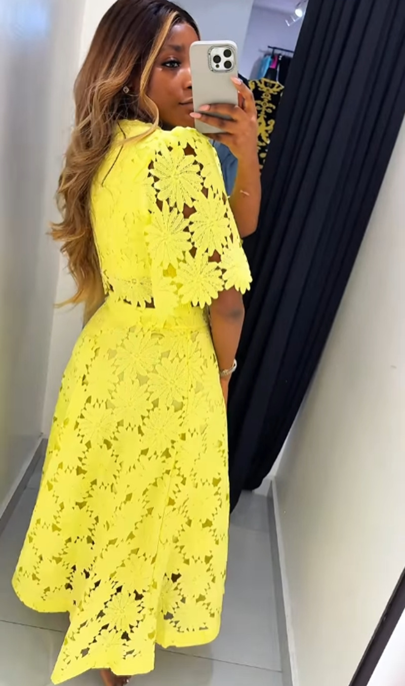 Our two-piece set is crafted from a blend of soft cotton and durable polyester, ensuring a comfortable fit and long-lasting quality. The elegant floral pattern, combined with delicate crochet detailing and a wrinkle-free treatment, adds a touch of sophistication to your look. Available in a range of sizes (S to 3XL) and colors (blue, yellow, pink, white, and black), there's a set for every style.