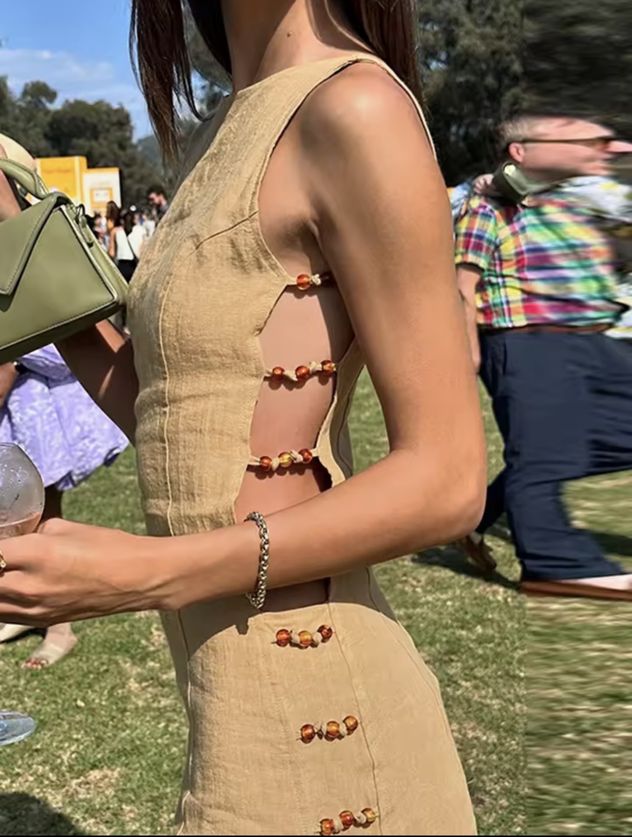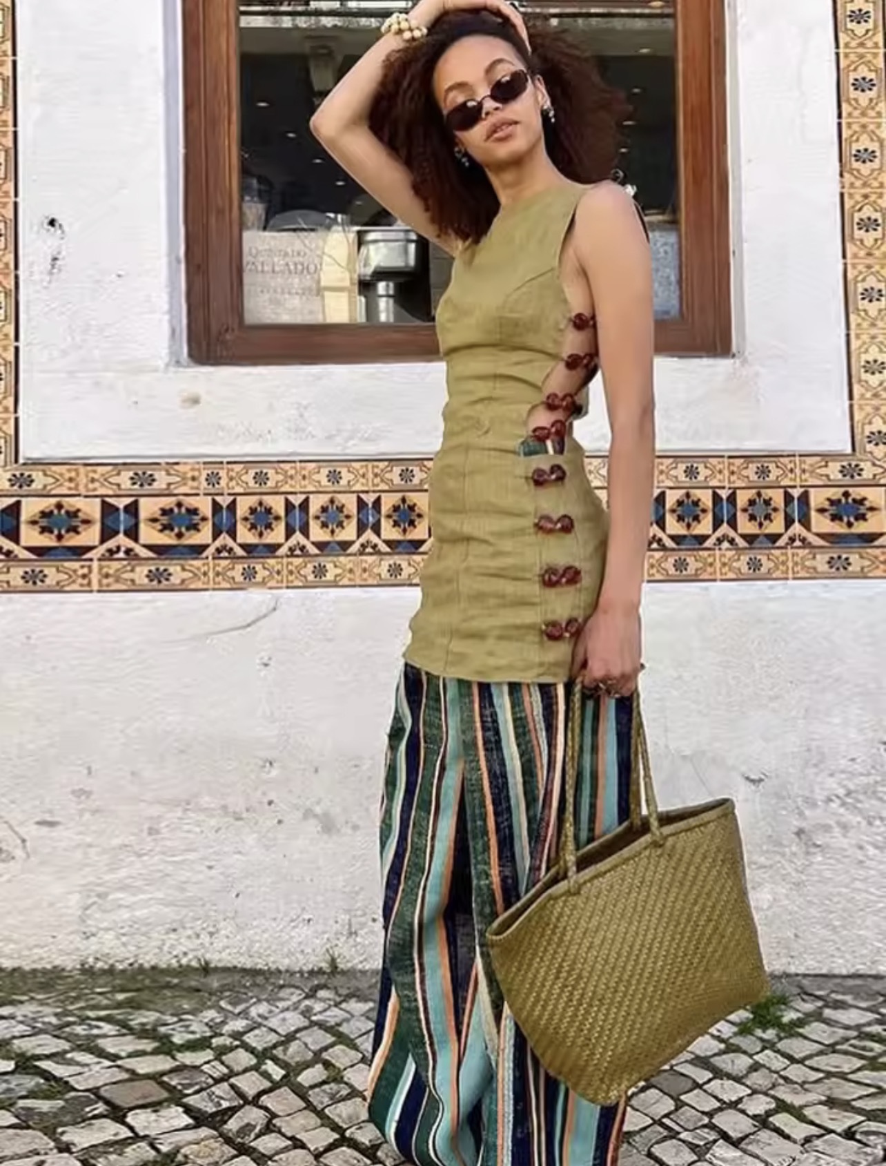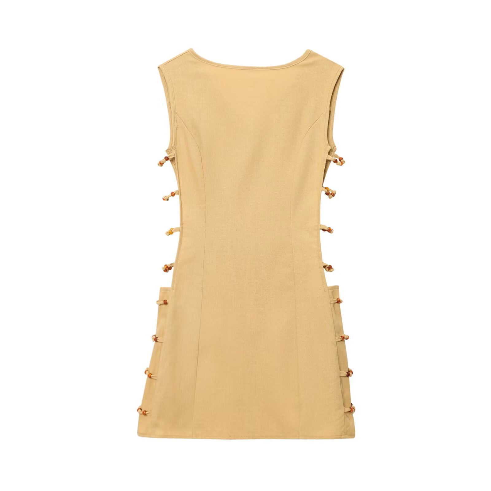 Make a bold statement with our elegant sleeveless linen dress. Featuring a stylish waist cut-out and a flattering mid-waist fit, this solid-color dress is perfect for any occasion.
