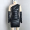 This daring dress features a slant neckline and cinches at the waist and hips, highlighting your curves with bold style.