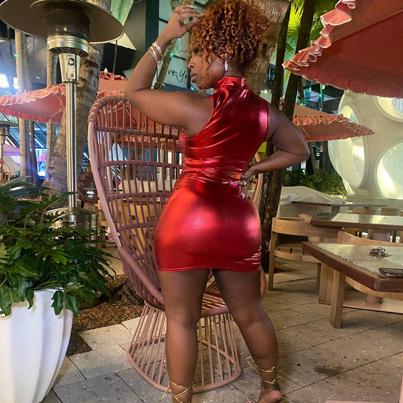 This dress features a bold stand-up collar and a sleek bag hip design, perfect for making a confident style statement.