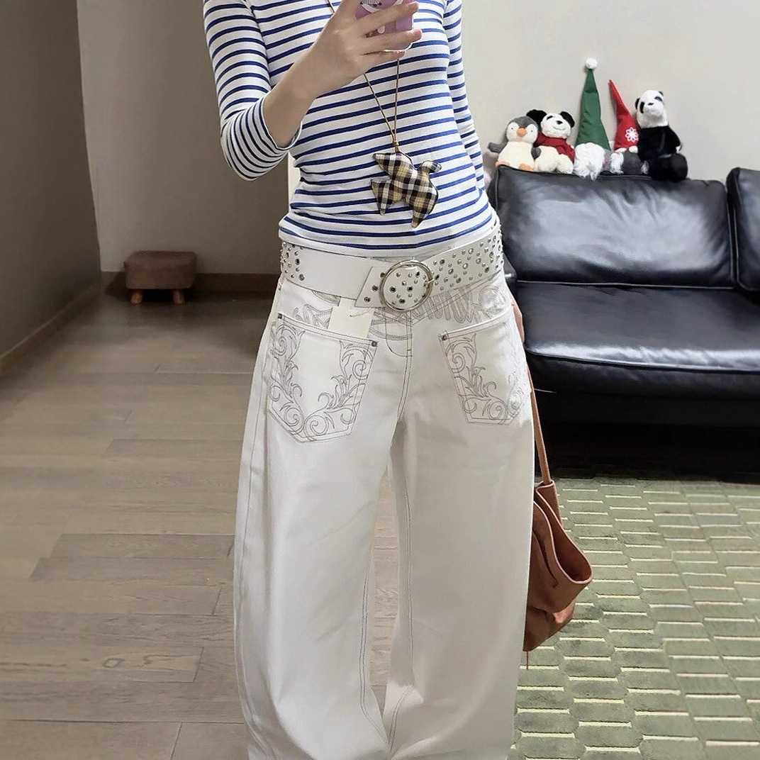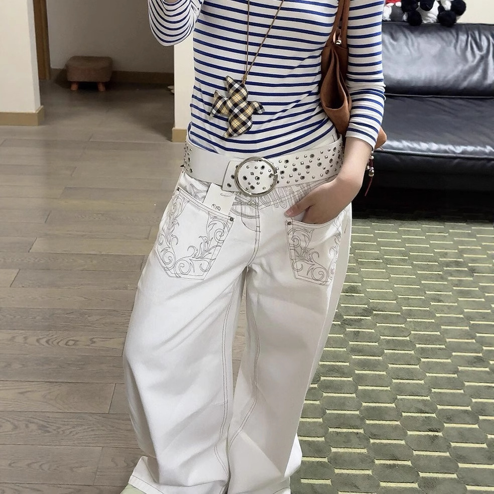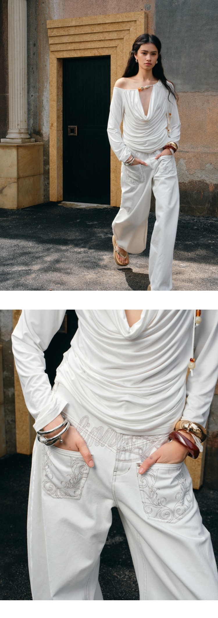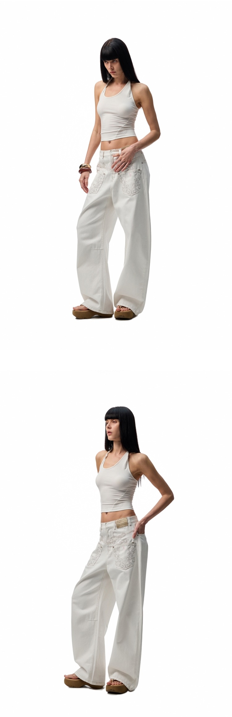 Stand out from the crowd with these retro-style curved knife jeans. Featuring a distinctive reverse embroidered pattern, these white jeans are made from comfortable, high-quality cotton. The unique cut offers a modern, edgy look while maintaining a classic feel.