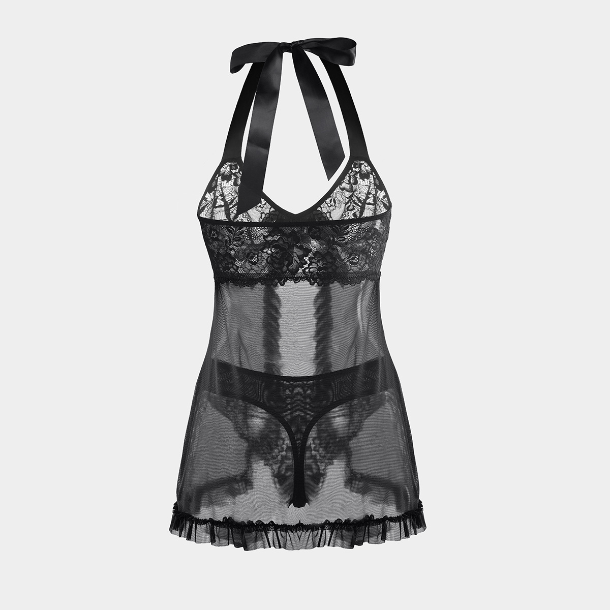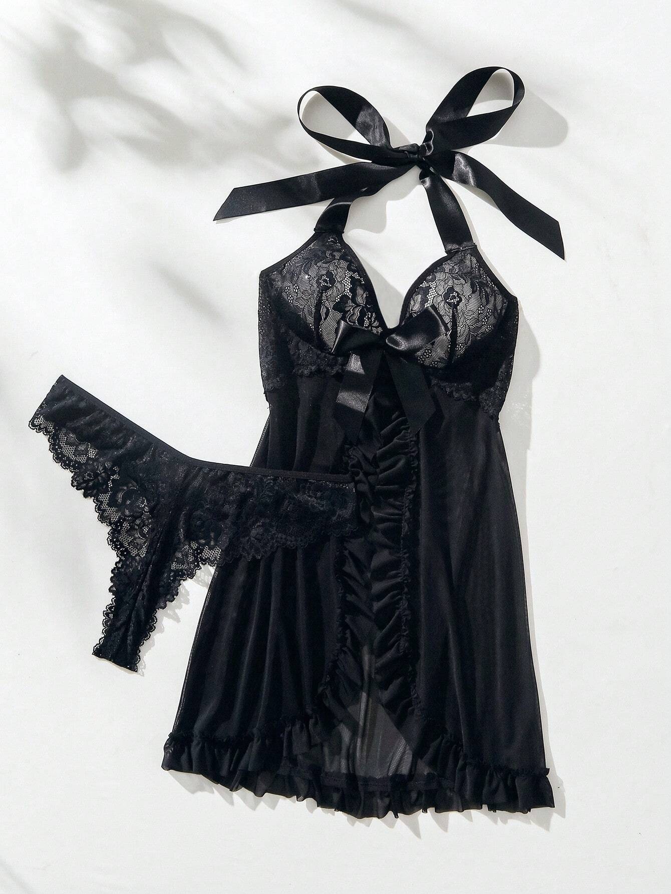 A close-up shot of an elegant lace and sheer bowknot lingerie dress in black, highlighting the intricate lace details and the delicate bowknot.