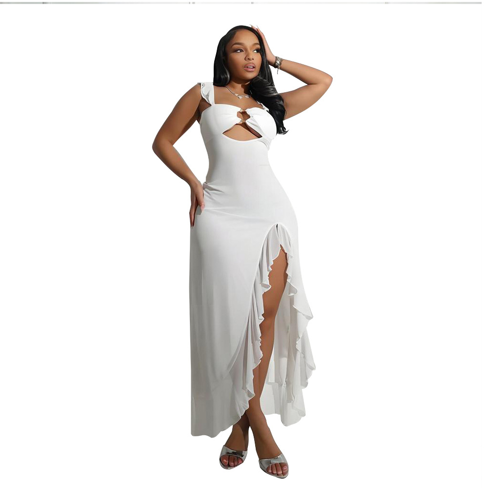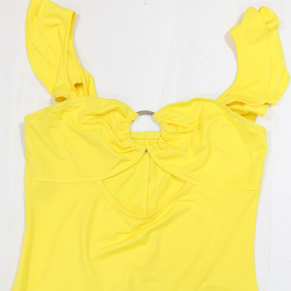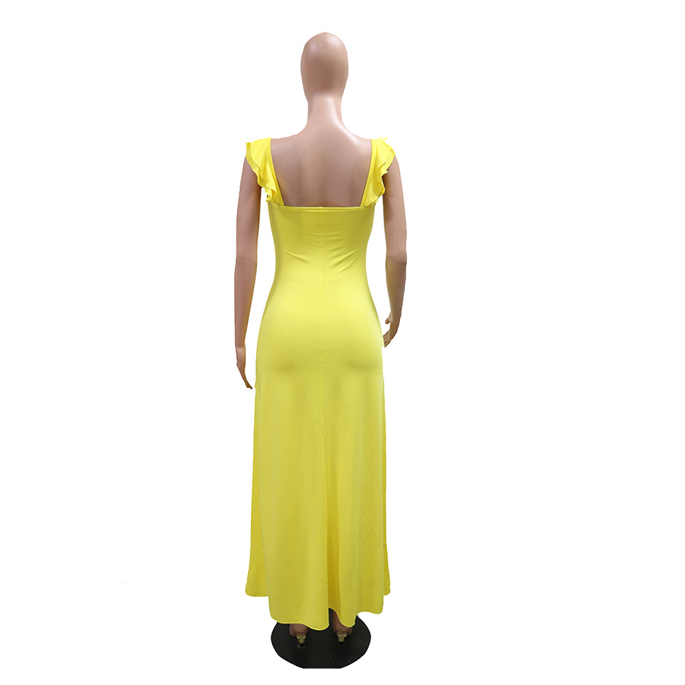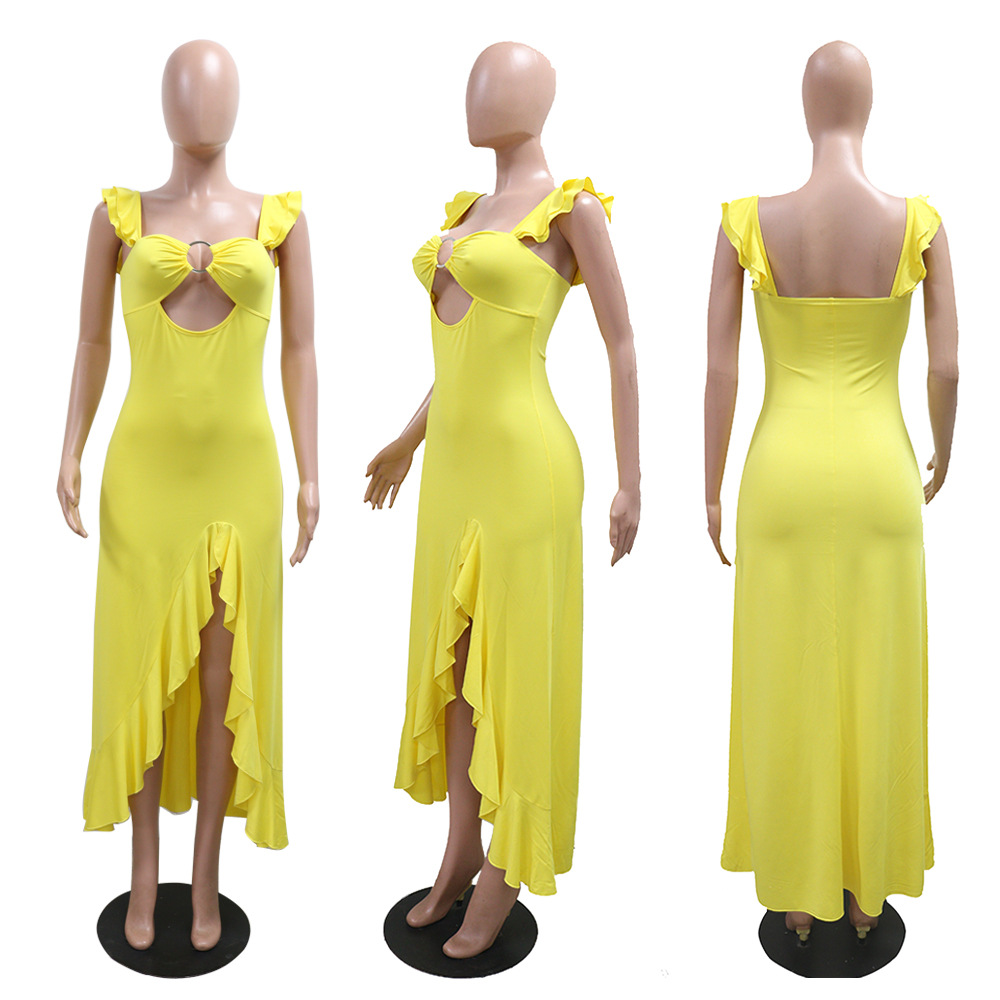 Step out in style with this elegant yellow long dress featuring a chic hollow-out design and a subtle slit. Perfect for any occasion, its fresh and sweet style will make you stand out.