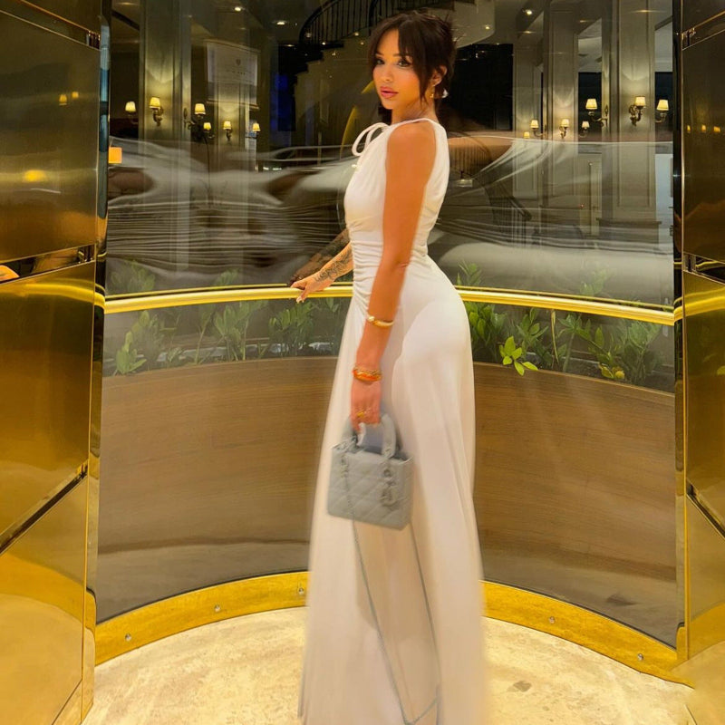 This daring midi dress features a lace-up design and a stylish hanging neck, perfect for making a bold statement with effortless flair.