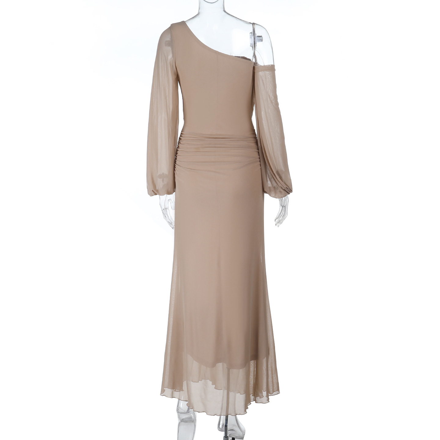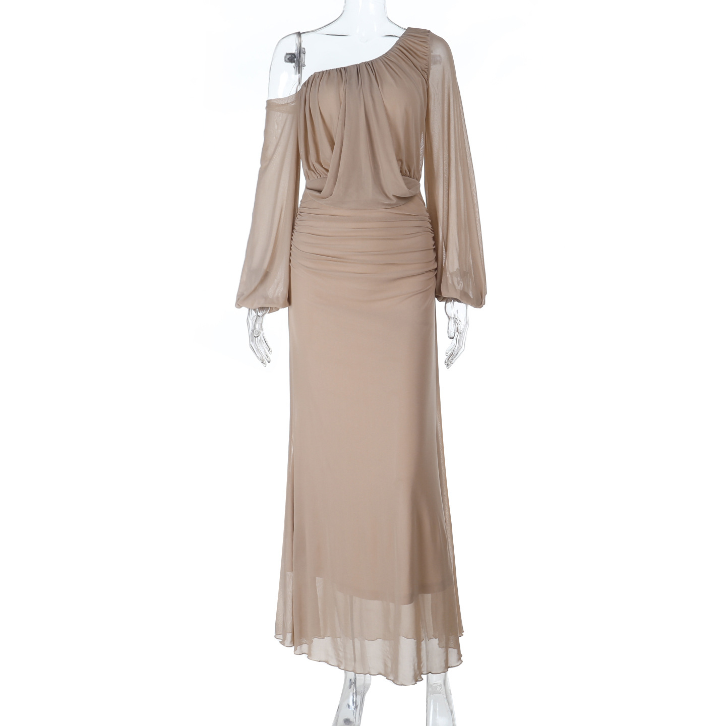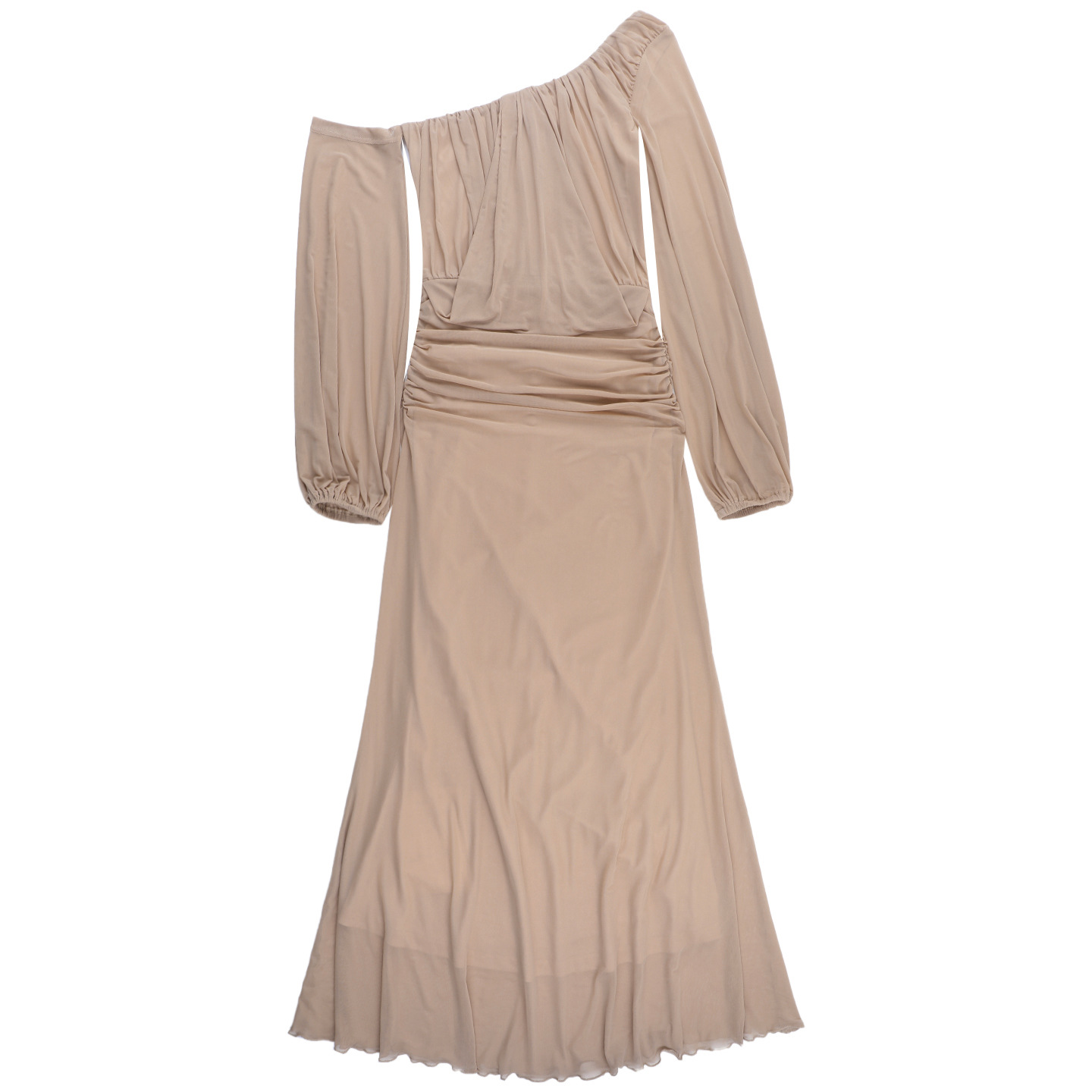 Take risks with our Mesh Slant Shoulder Midi Dress! This daring and bold apricot dress features a comfortable nylon fabric, a fashionable one-shoulder/slant-shoulder design, and a flattering high waist. The mid-length cut and long sleeves make it perfect for a chic casual occasion. Available in sizes S, M, and L.