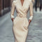 The silhouette is meticulously tailored from a premium blend of 95% polyester and 5% elastane, ensuring a flattering fit that moves gracefully with your body. The deep V-neckline offers a touch of allure while elongating the frame, and the long sleeves provide a sleek, polished finish suitable for transitioning from a high-powered boardroom meeting to an intimate evening dinner. Whether you choose the classic, commanding depth of Black or the crisp, fresh vitality of White, this midi dress serves as the ultimate canvas for your personal expression.