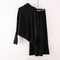 This two-piece ensemble features an elastic, slightly thick, soft, and comfortable fabric, with a semi-high collar irregular loose top and wide-leg pants with elastic waistband. Washing instructions: suitable for hand washing; do not bleach; low-iron; dark clothes should be washed separately from light-colored items. Try-on record reference: fits heights over 160 cm and weights 90-145kg. Measurements: top bust (110cm) with great elasticity; length (67cm); sleeve (61cm); pants length (102cm); waist (64-95cm).