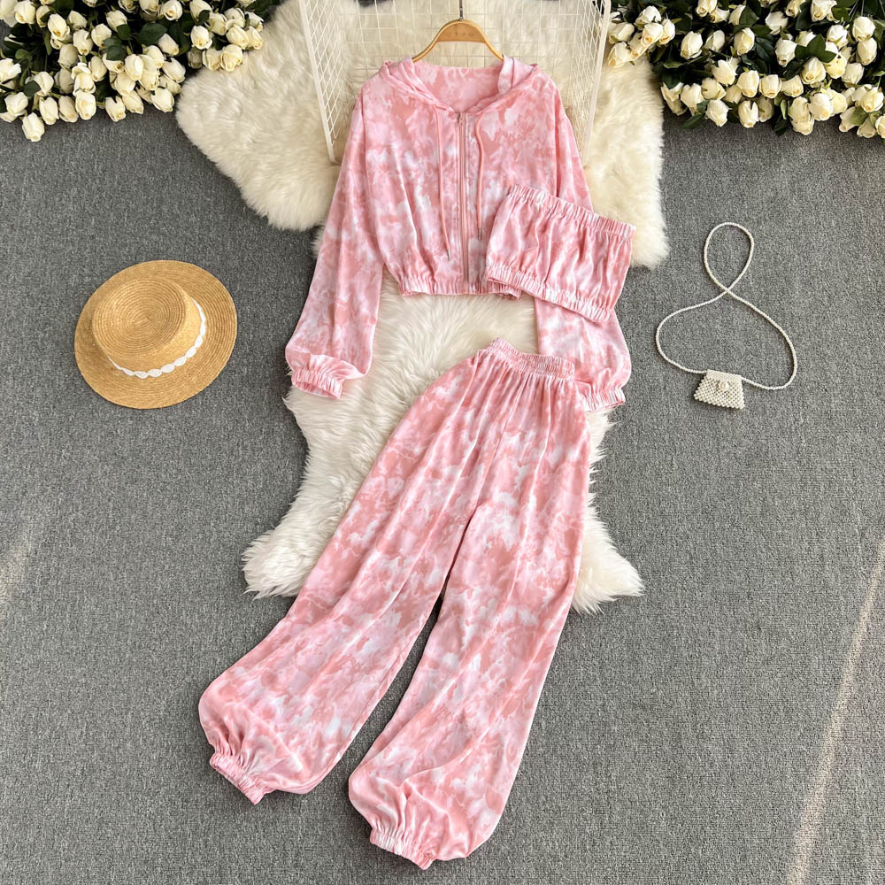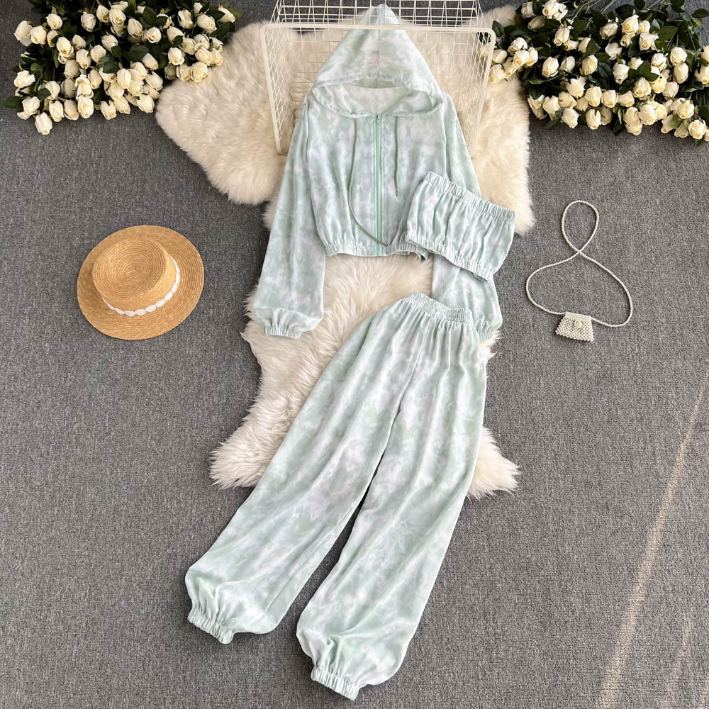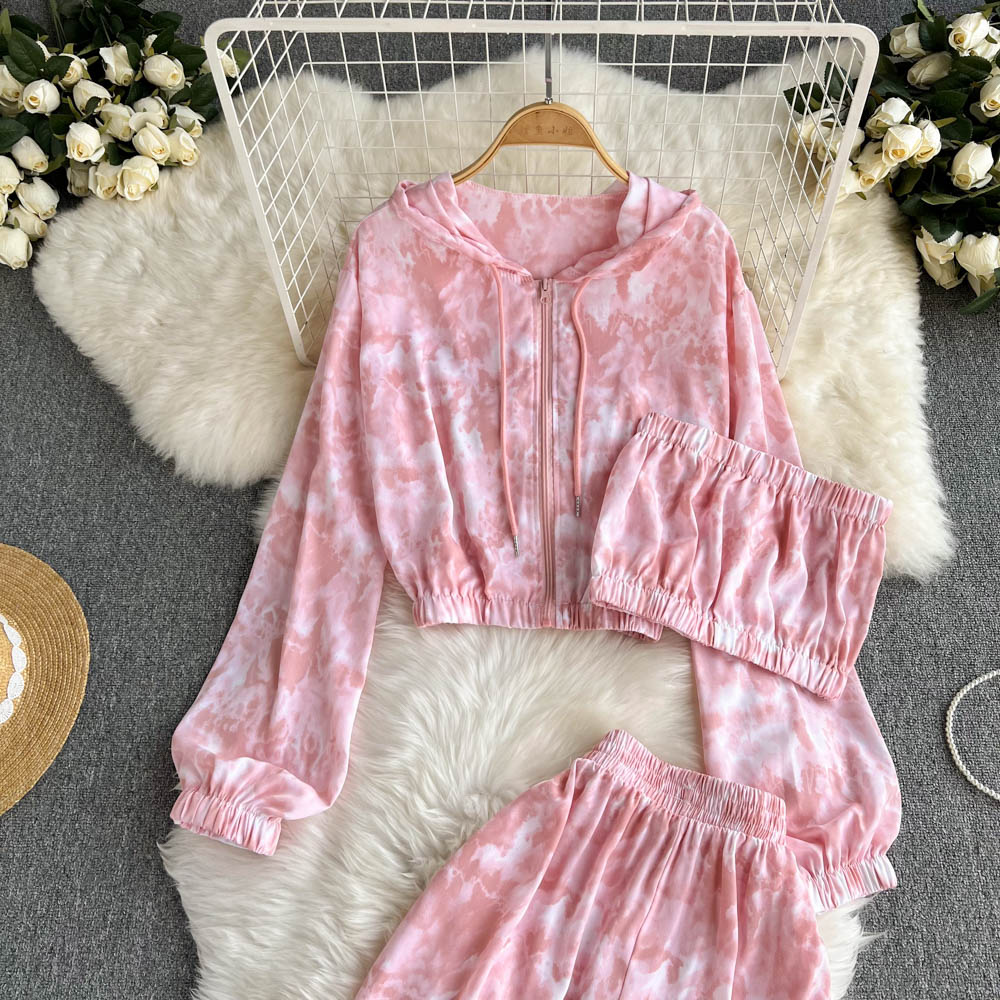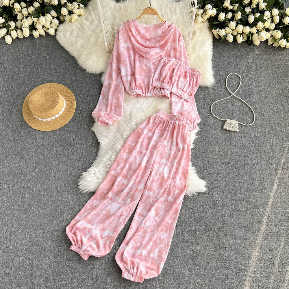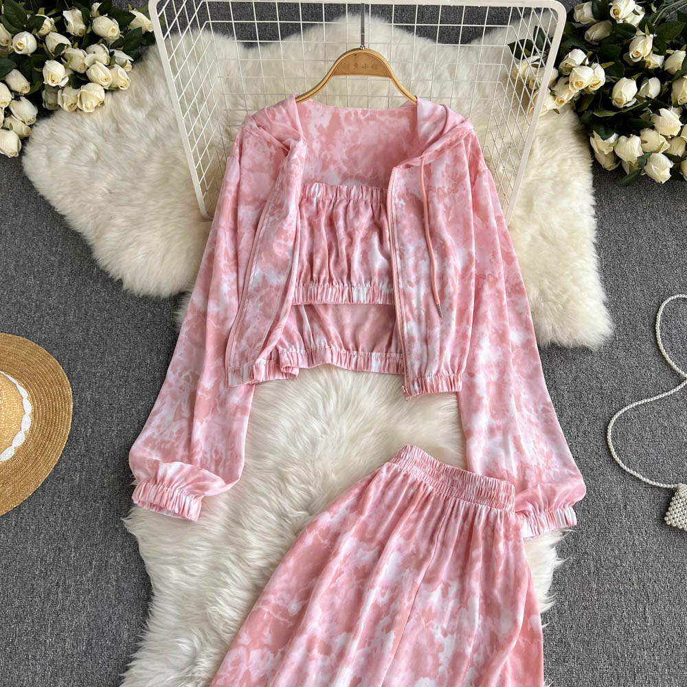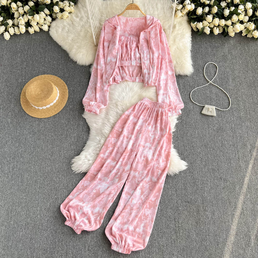 This Retro Tie-Dye Three Piece Set is crafted from a blended fabric. Please note: matching brand hats, accessories, bags, and shoes are strictly for styling purposes, not for sale. In addition, the display and shooting environment may cause a slight difference in the product's color compared to its pictured version.