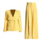 V-neck waist slimming suit+high waisted pleated wide leg pants set This set exudes effortless elegance and sophistication. The slimming V-neck design flatters your figure and the high waisted pleated pants elongate your legs for a statuesque silhouette. The perfect ensemble for a luxurious and stylish look.