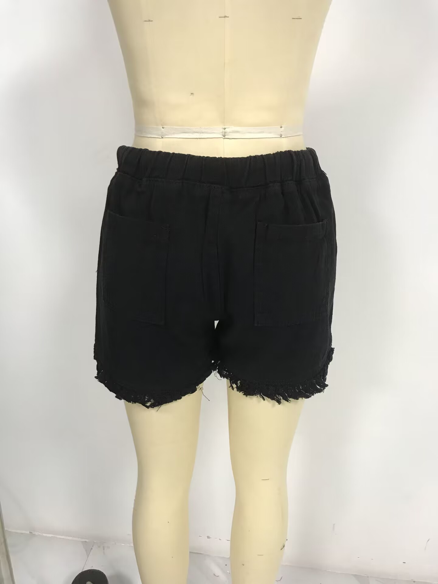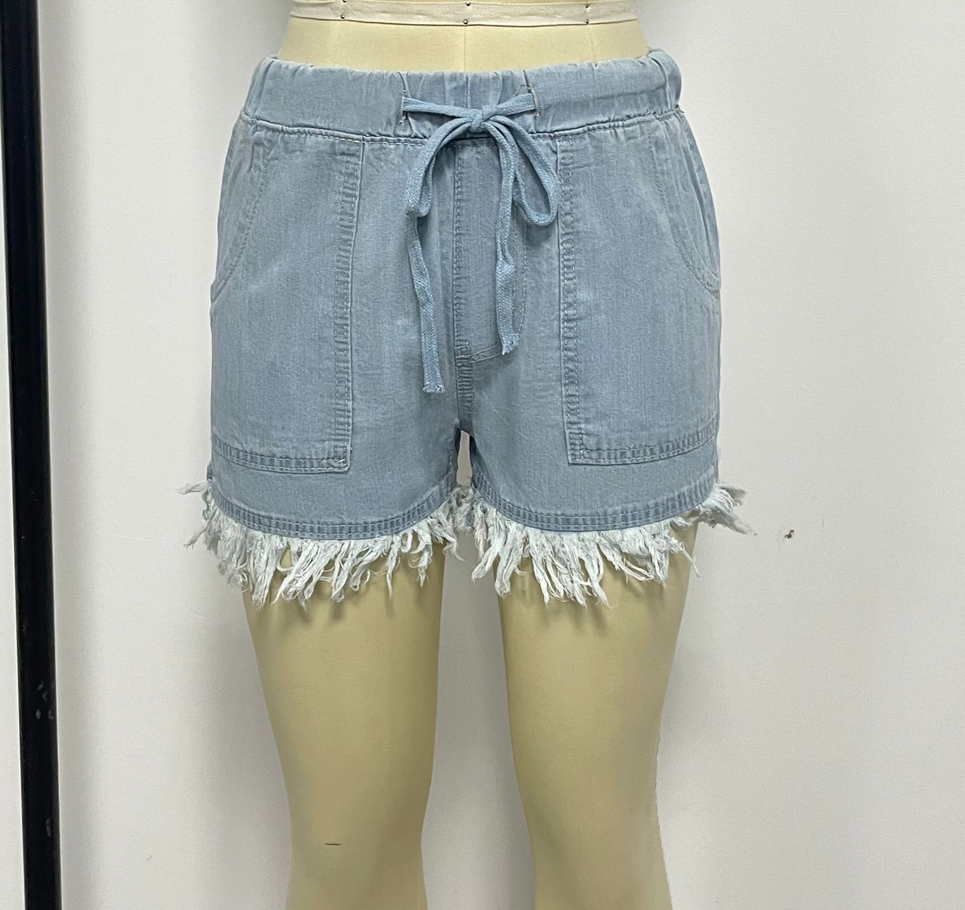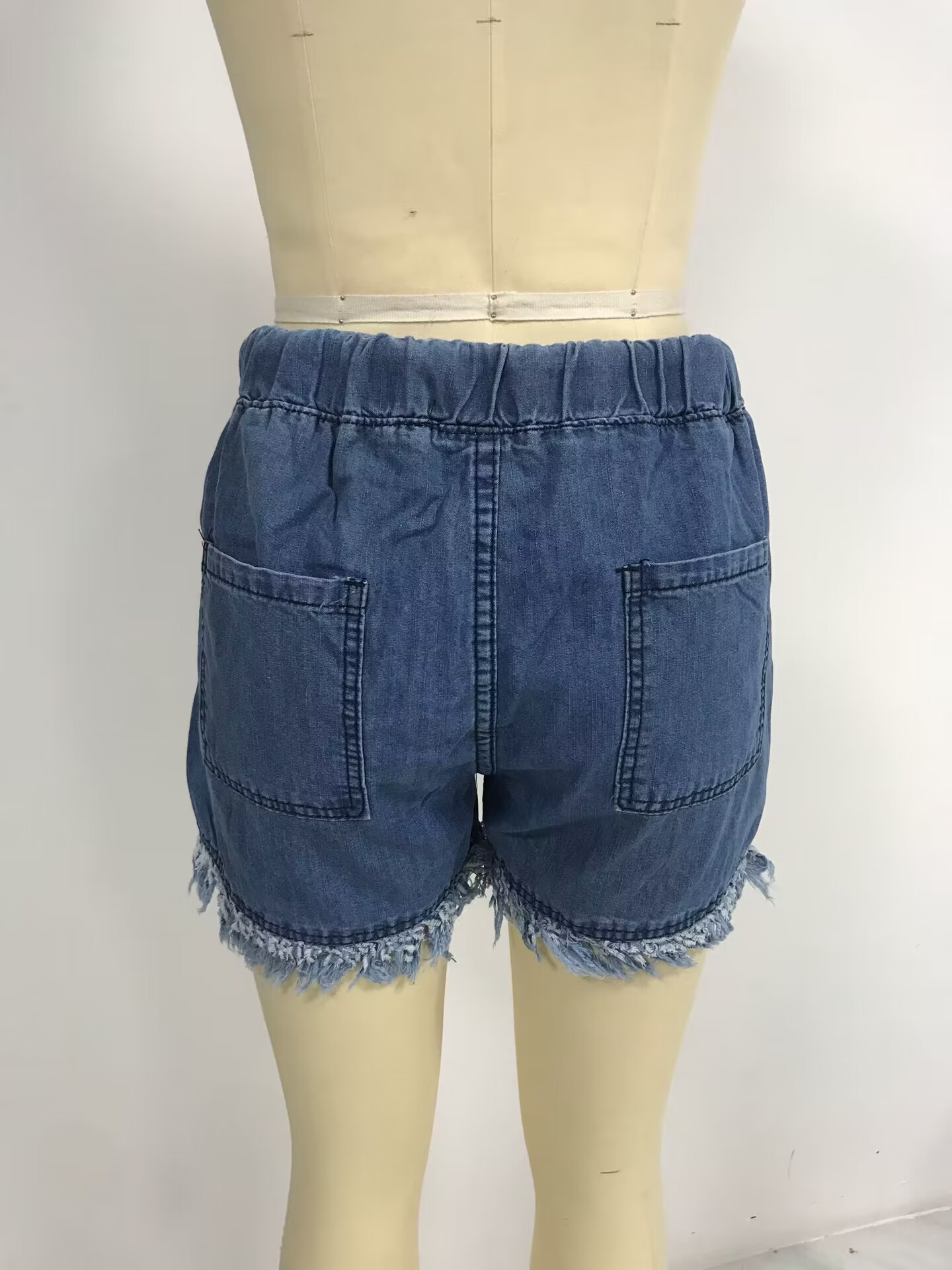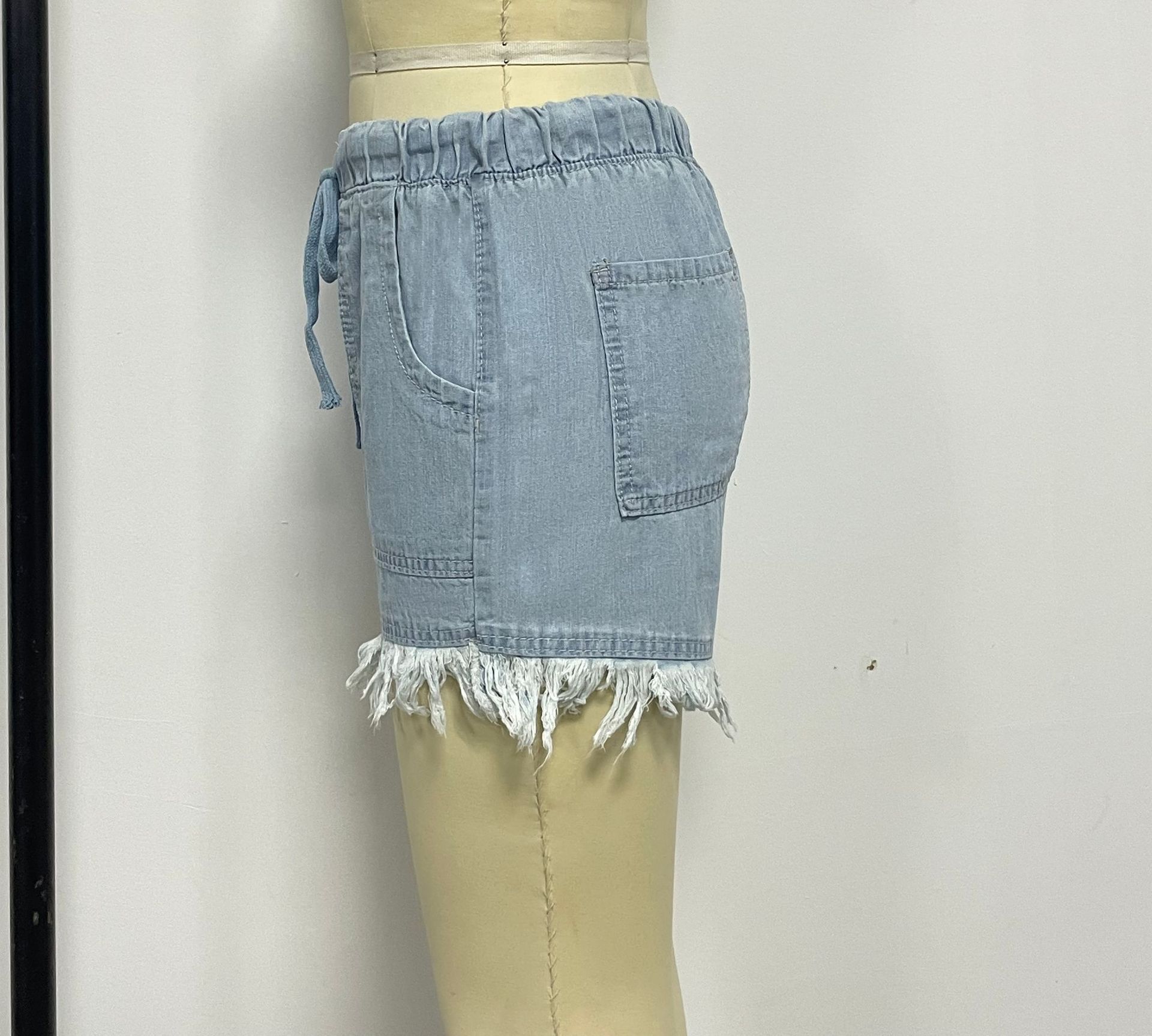 These denim shorts feature a bold fringe detail and an elastic waist for a fierce, comfortable fit. Perfect for making a daring statement.
