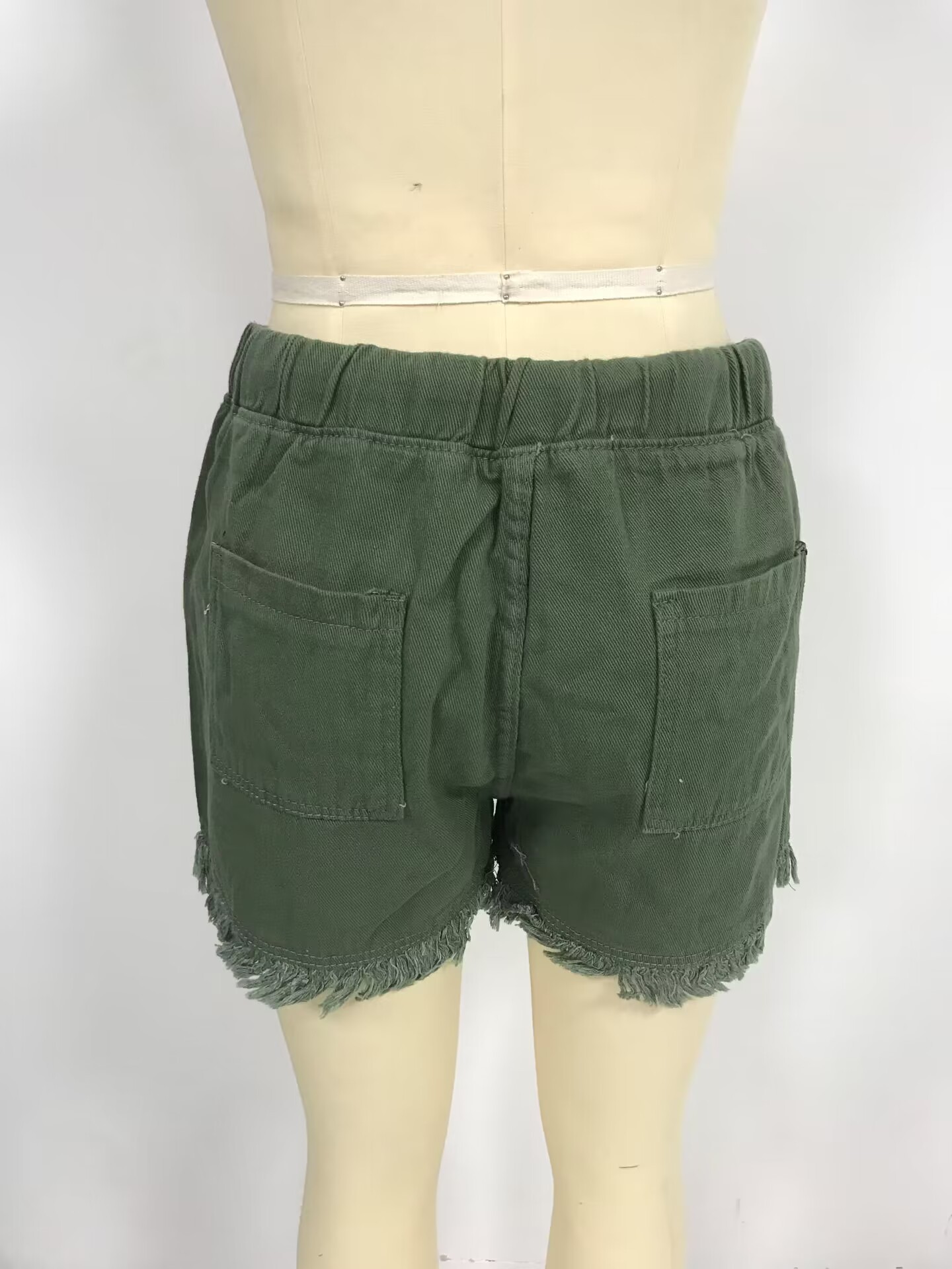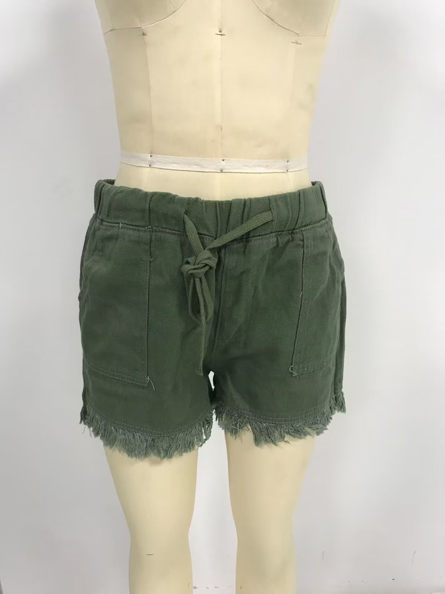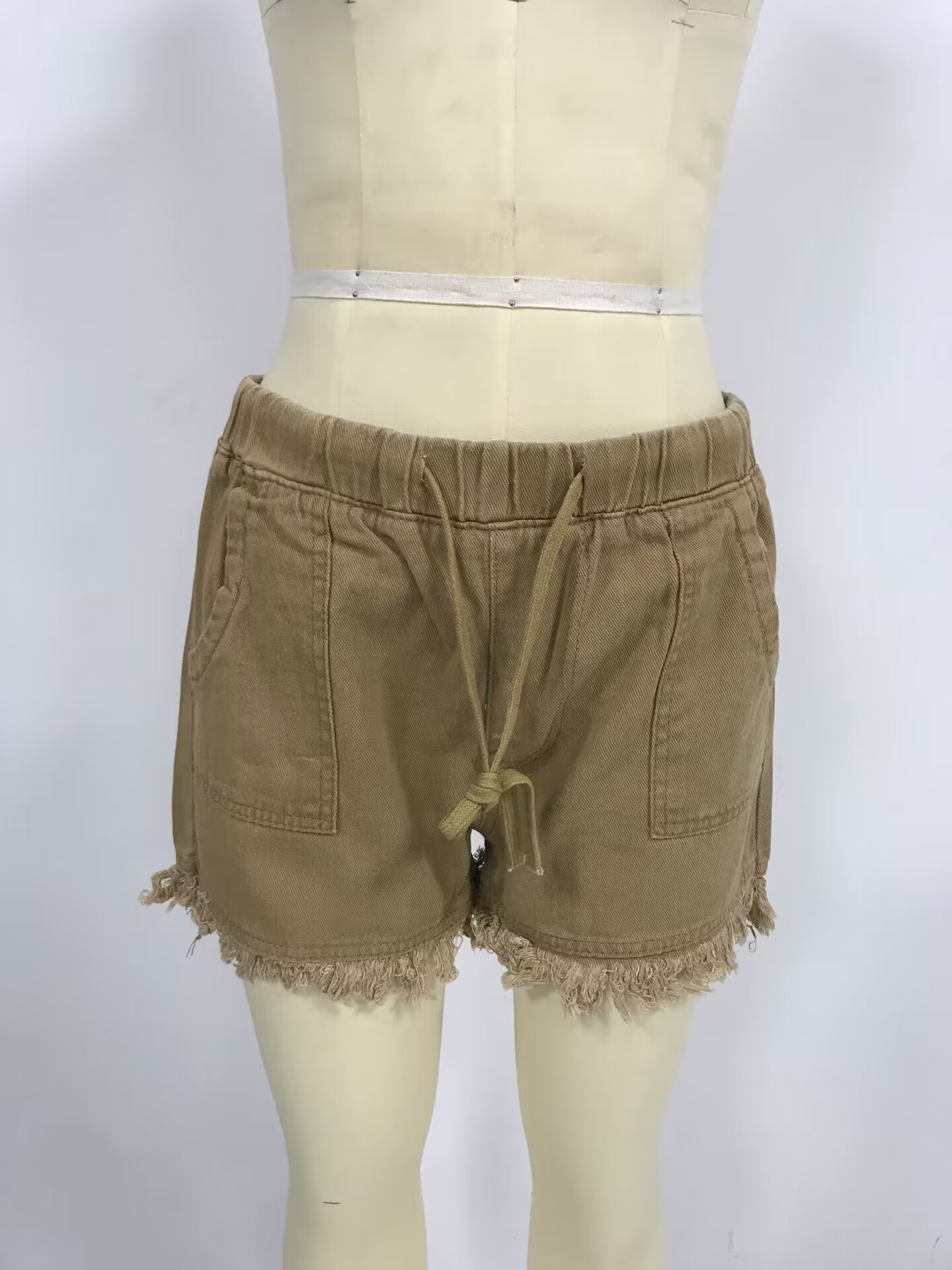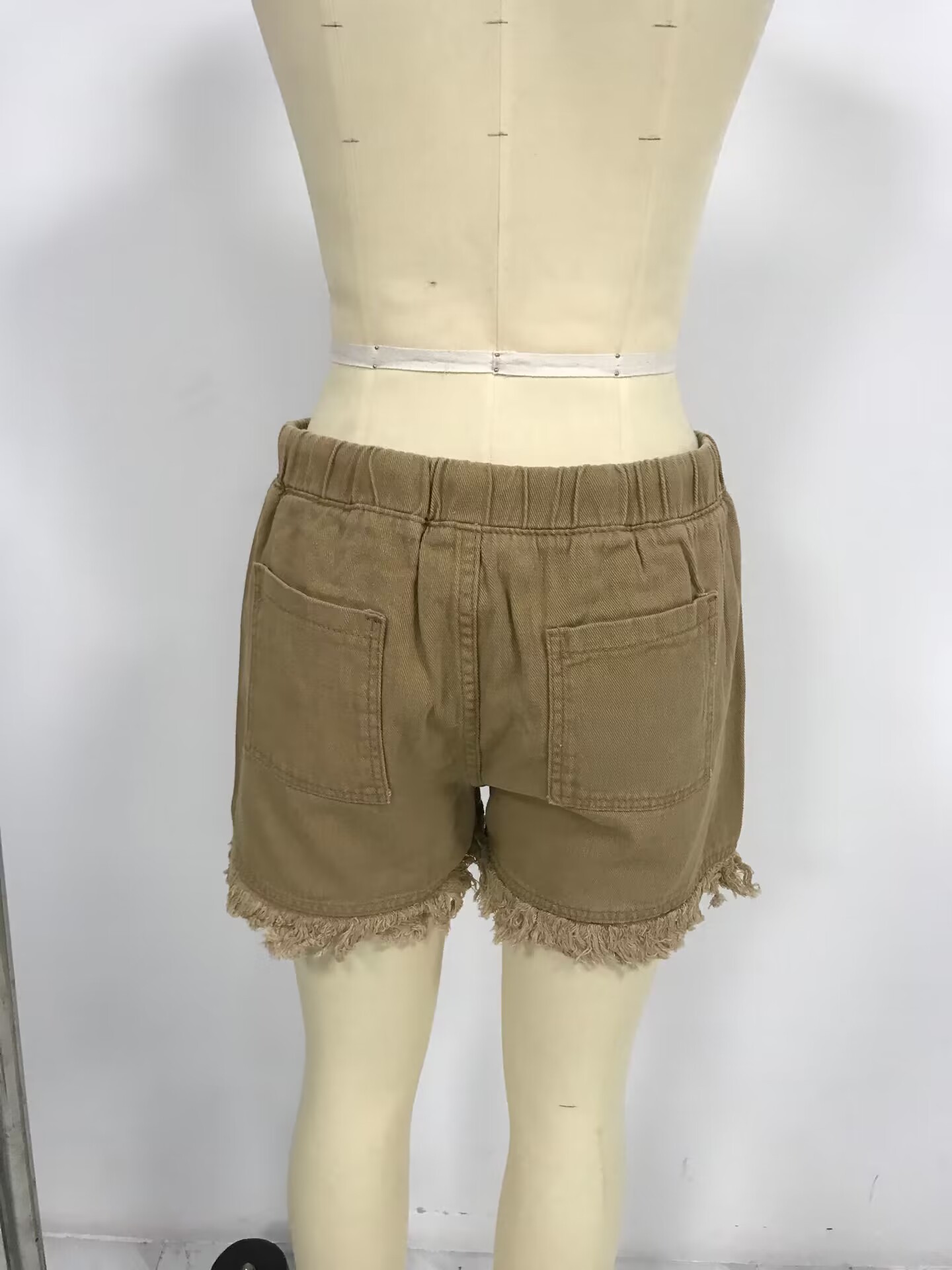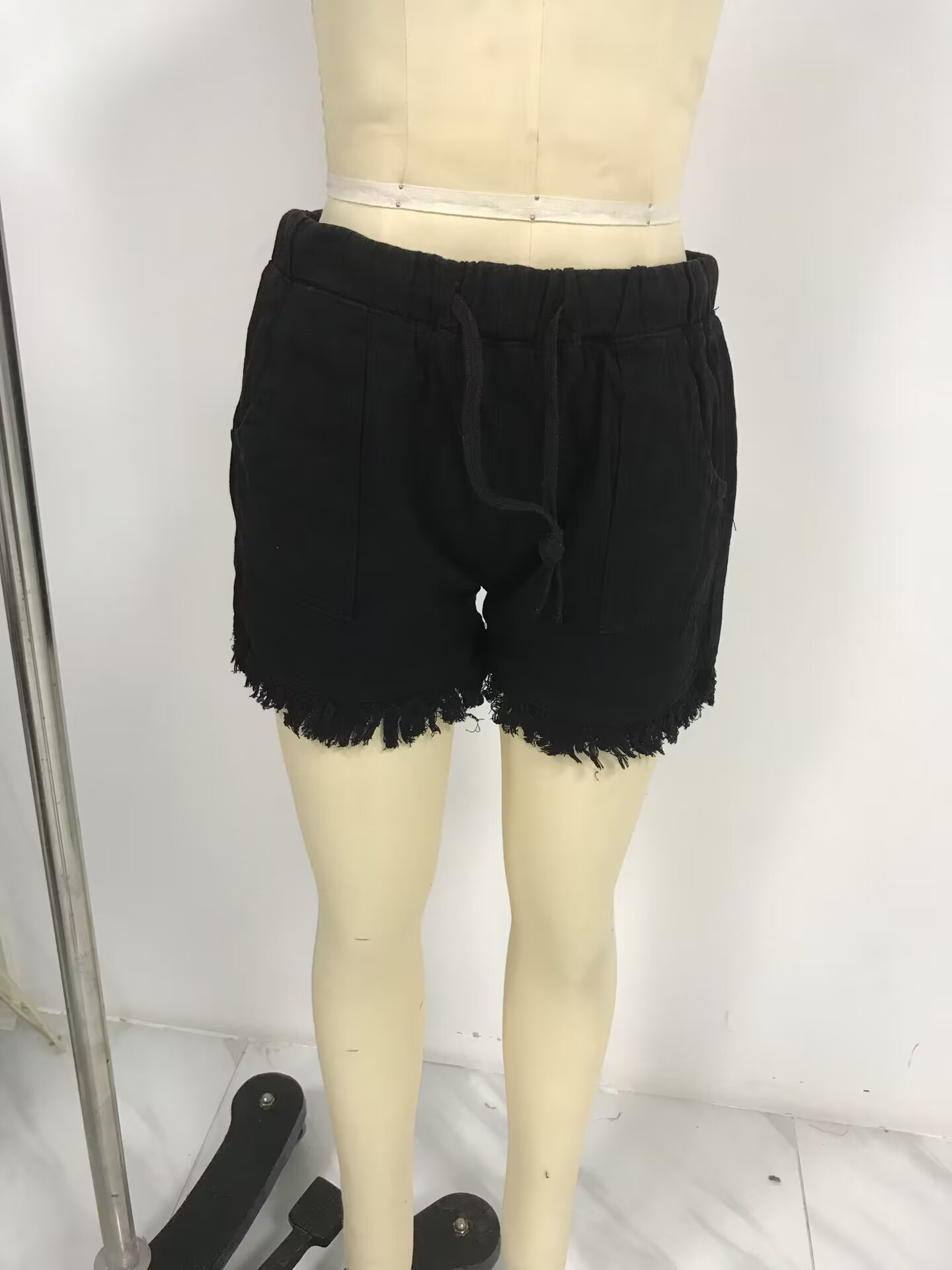 These denim shorts feature a bold fringe detail and an elastic waist for a fierce, comfortable fit. Perfect for making a daring statement.