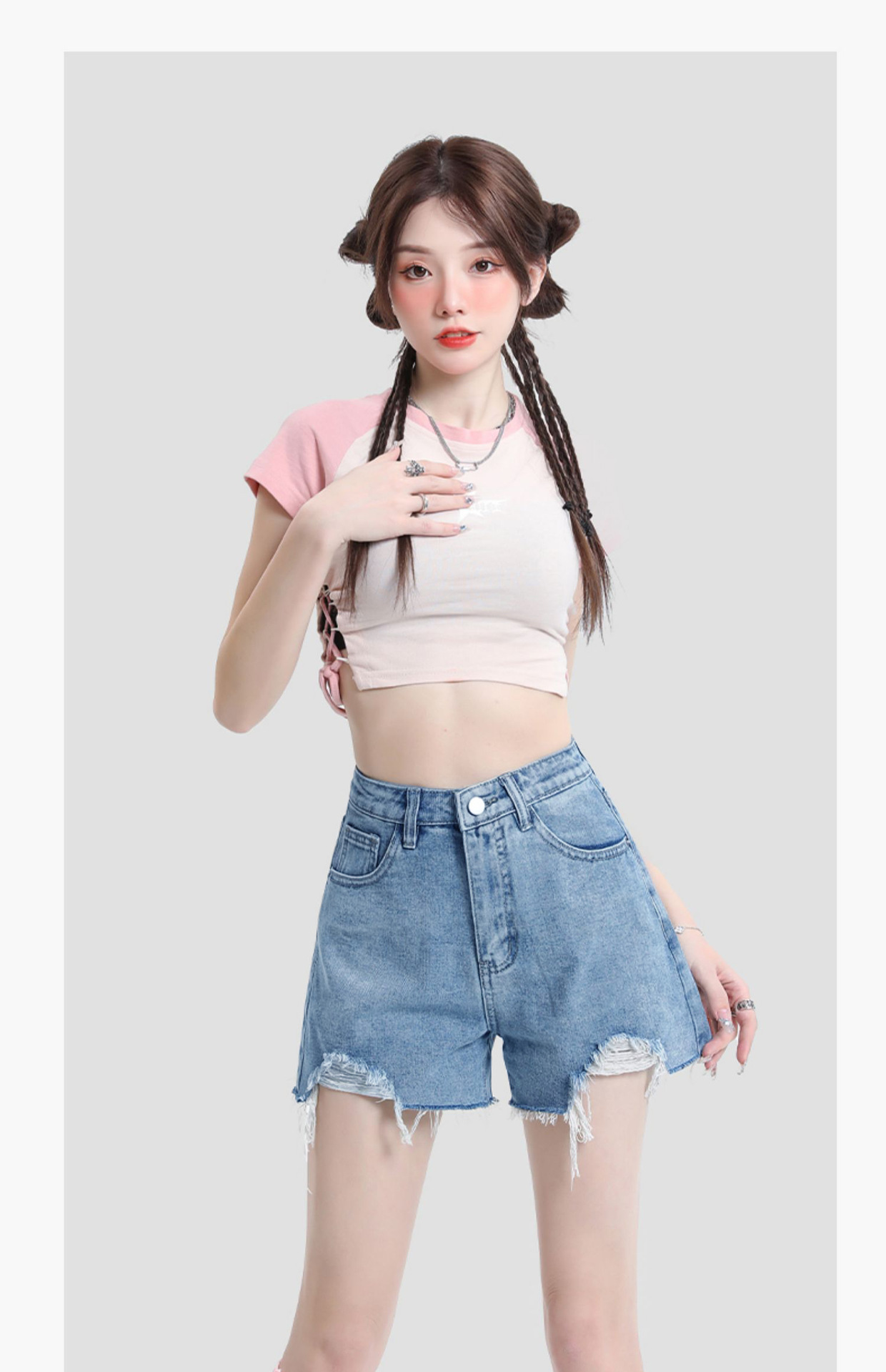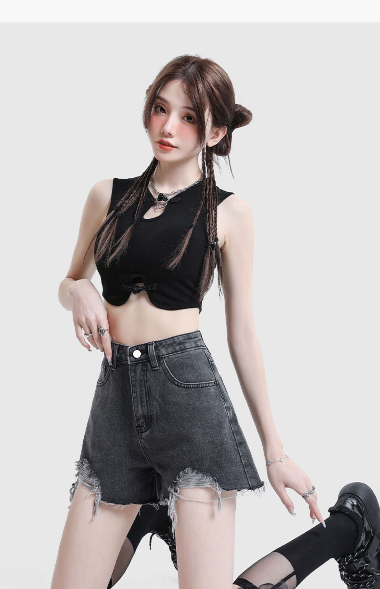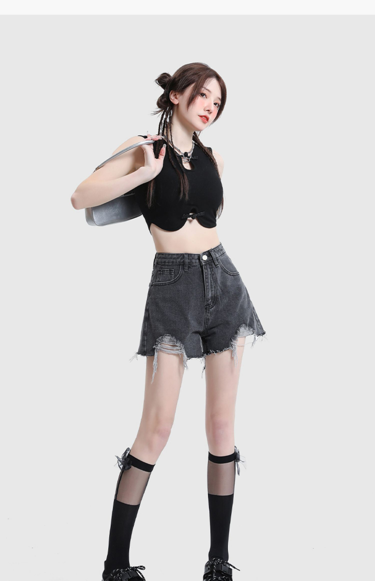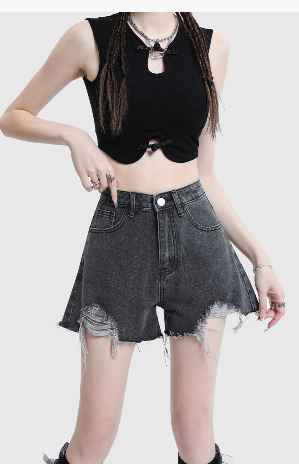 High-waisted denim shorts with a loose, wide leg fit and edgy distressed details for a bold, standout look.