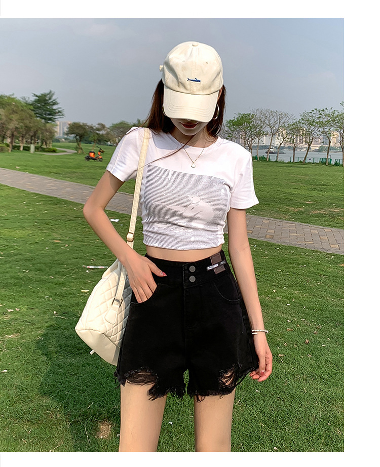 High-waisted denim shorts with a bold double-button design for a confident, casual look.