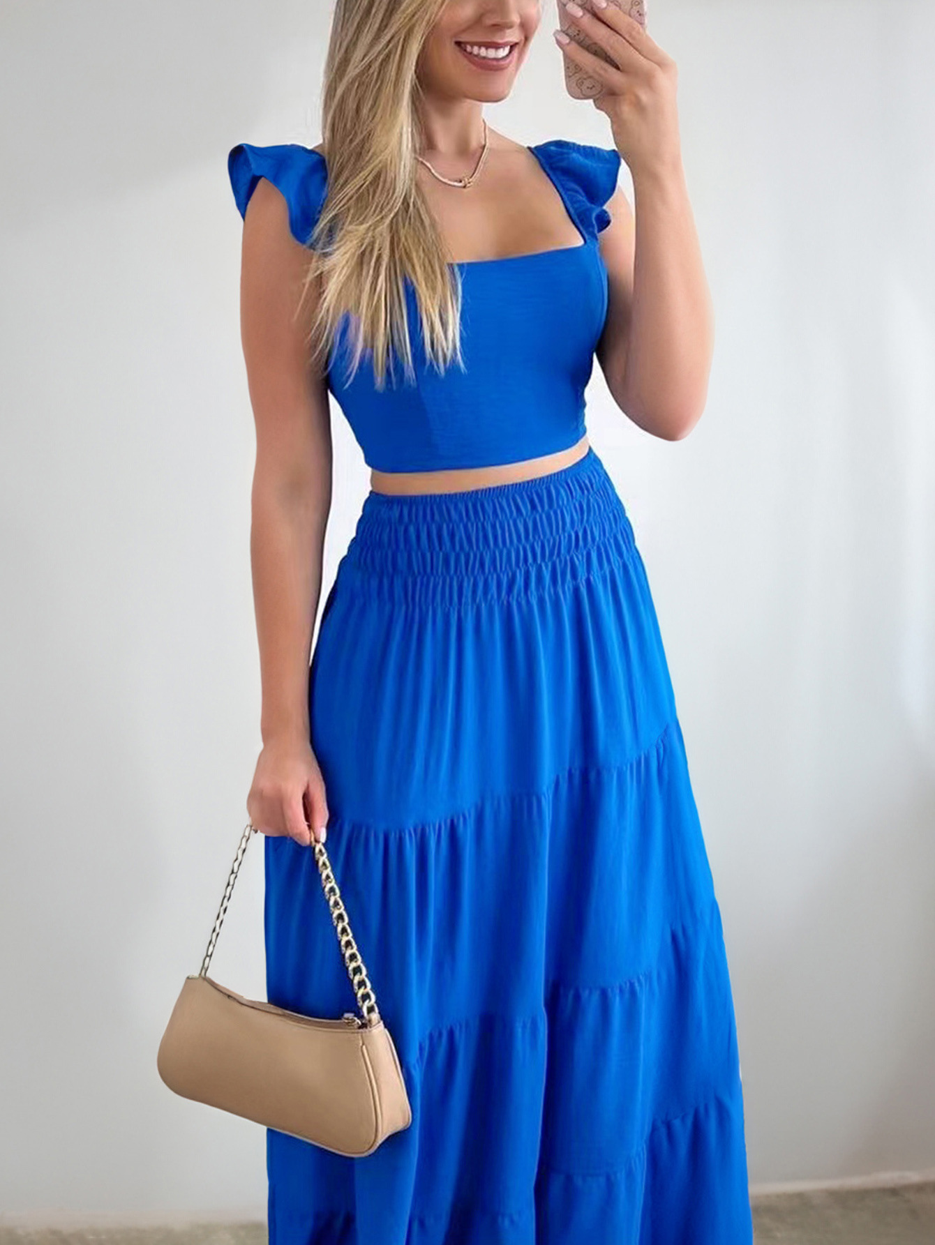 This set features a short-sleeve top and an A-line cake skirt for a casual yet daring look that stands out with effortless flair.