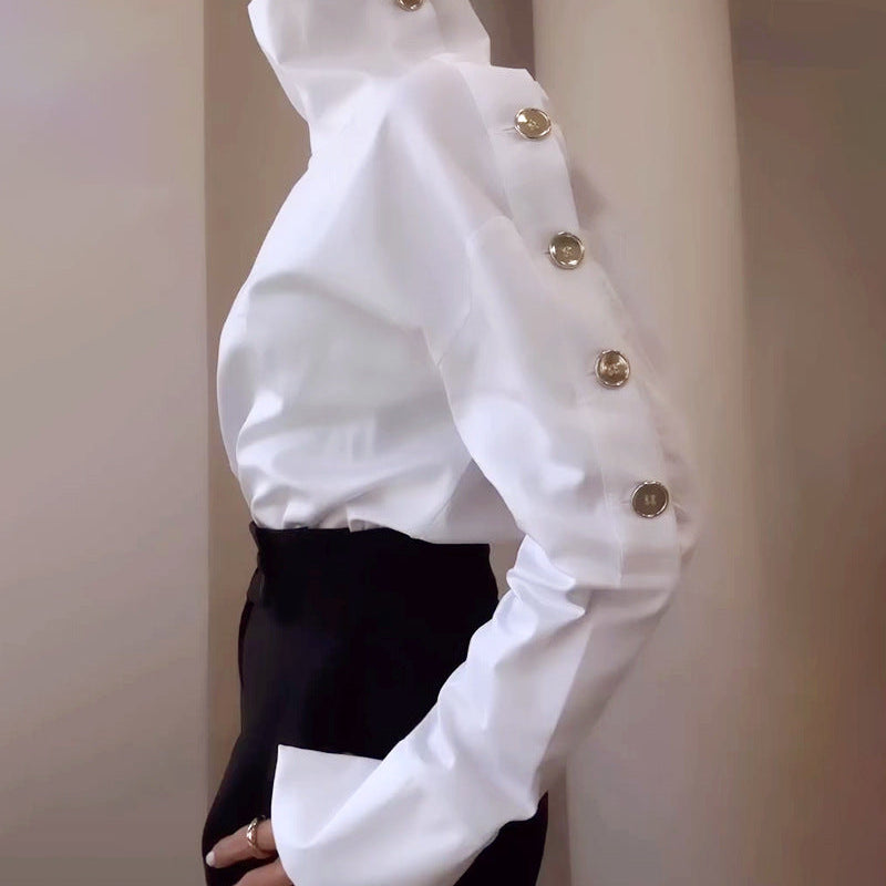Chic Commute: The High Neck Metal Button Off-Shoulder Top