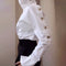 How to Style For the ultimate "Chic Commute" look, tuck this slim-fit top into high-waisted charcoal trousers or a structured midi skirt. The crisp white fabric and metal detailing demand a polished silhouette. For a more relaxed yet upscale weekend vibe, pair it with slim-fit indigo denim and pointed-toe heels.