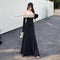 This black midi dress is designed to command attention. It features a bold, asymmetrical one-shoulder design and long sleeves, creating an instantly striking look. Knitted patchwork textures layer visual intrigue, while the high, cinched waist ensures a flattering silhouette. Made primarily from Nylon knitted fabric, this dress is the epitome of bold, unapologetic style, perfect for the fashion-forward for any casual occasion. Available in sizes S, M, and L.