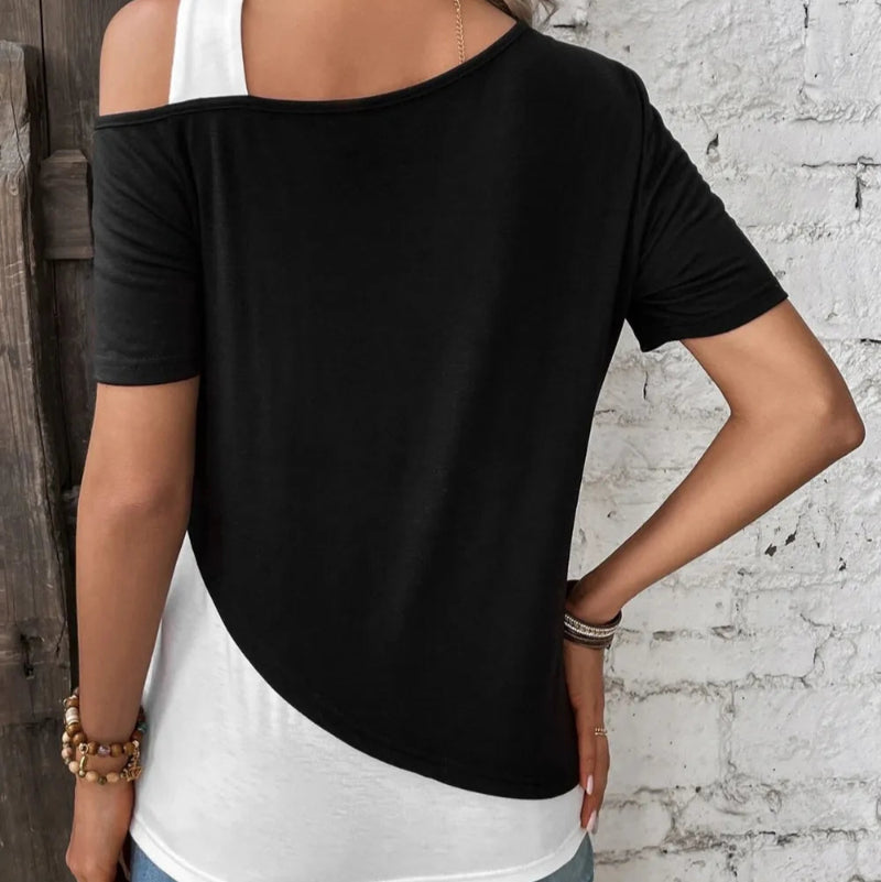 Contrast Asymmetrical Neck Short Sleeve T-Shirt