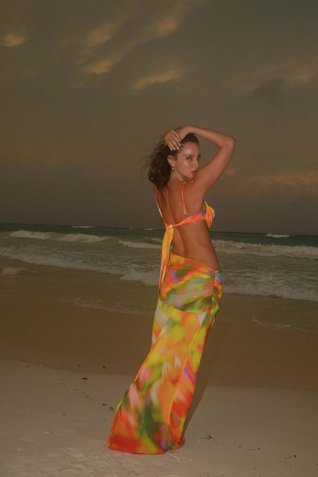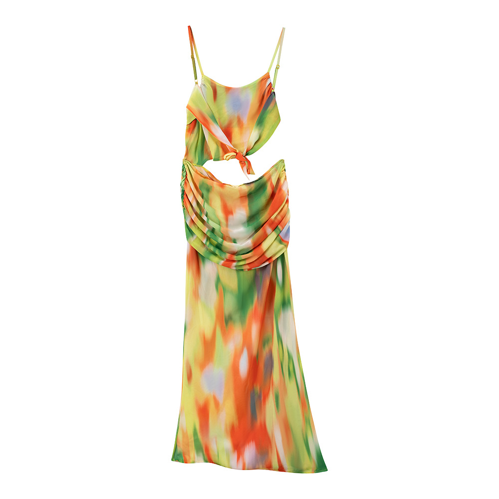 • Jewelry: Since the backless style is the main feature, choose minimal jewelry. A delicate anklet or a simple shell-accented necklace will add a beachy, natural touch without competing with the bold gradient print.