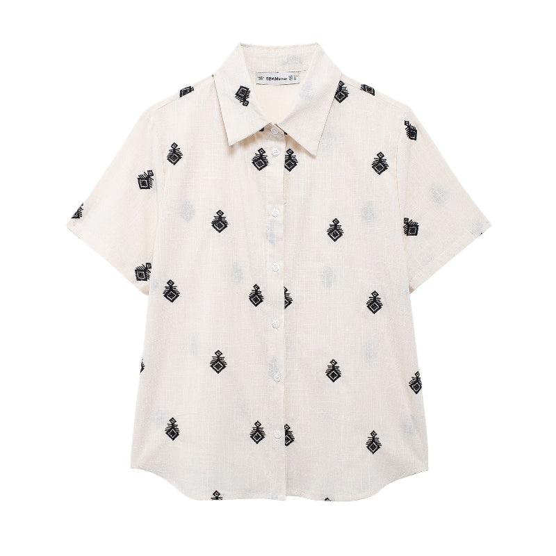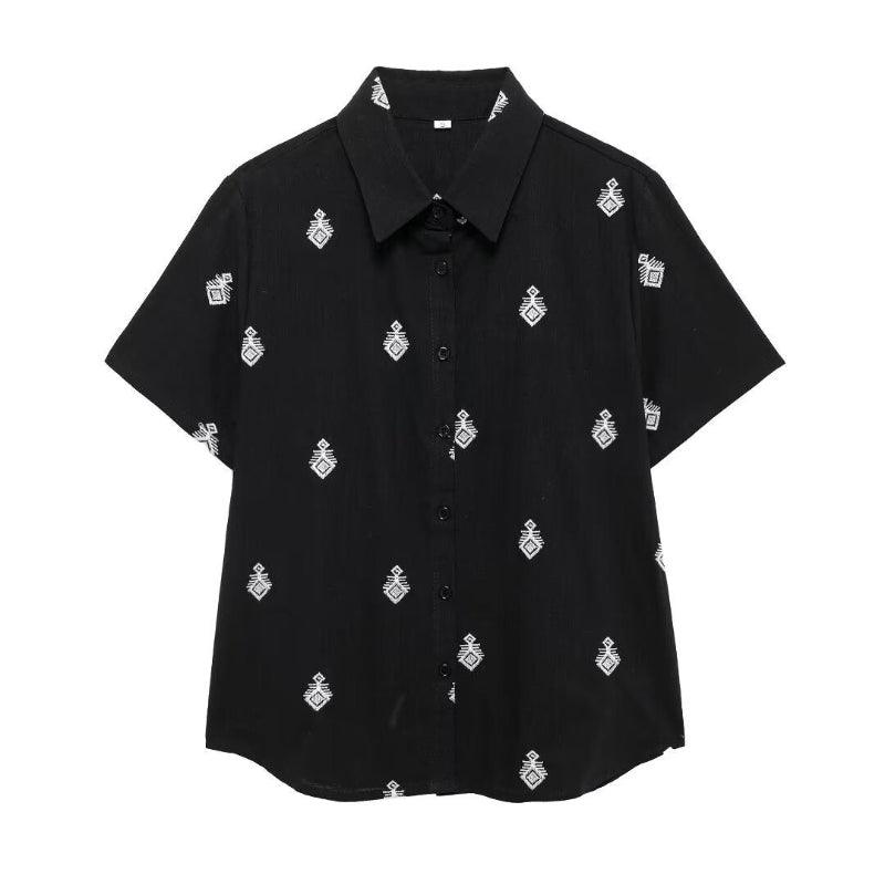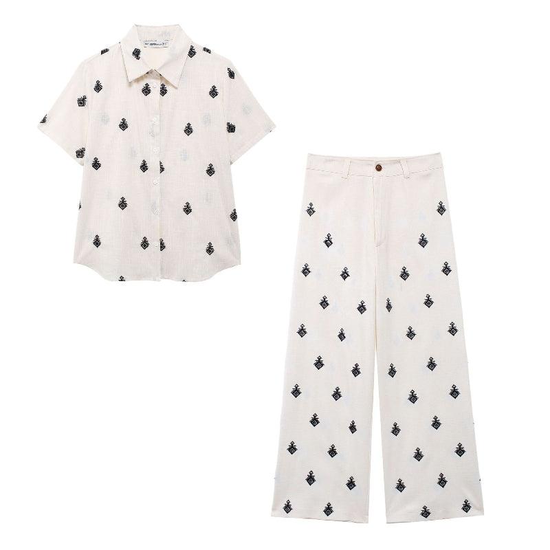 An effortless yet sophisticated addition to your wardrobe, this set features embroidered wide leg pants in an understated off-white and black color scheme. The leisure style and intricate embroidery add a touch of luxury to these breezy, short-sleeved pieces. Made from high-quality polyester fabric, the set is both comfortable and stylish, perfect for casual occasions. The regular fit and button closure provide a flattering silhouette, making it a must-have for any fashionable woman. Elevate your style with this statement set and revel in the artful details of its exquisite embroidery.