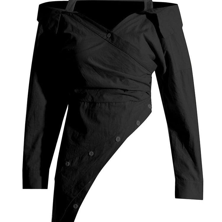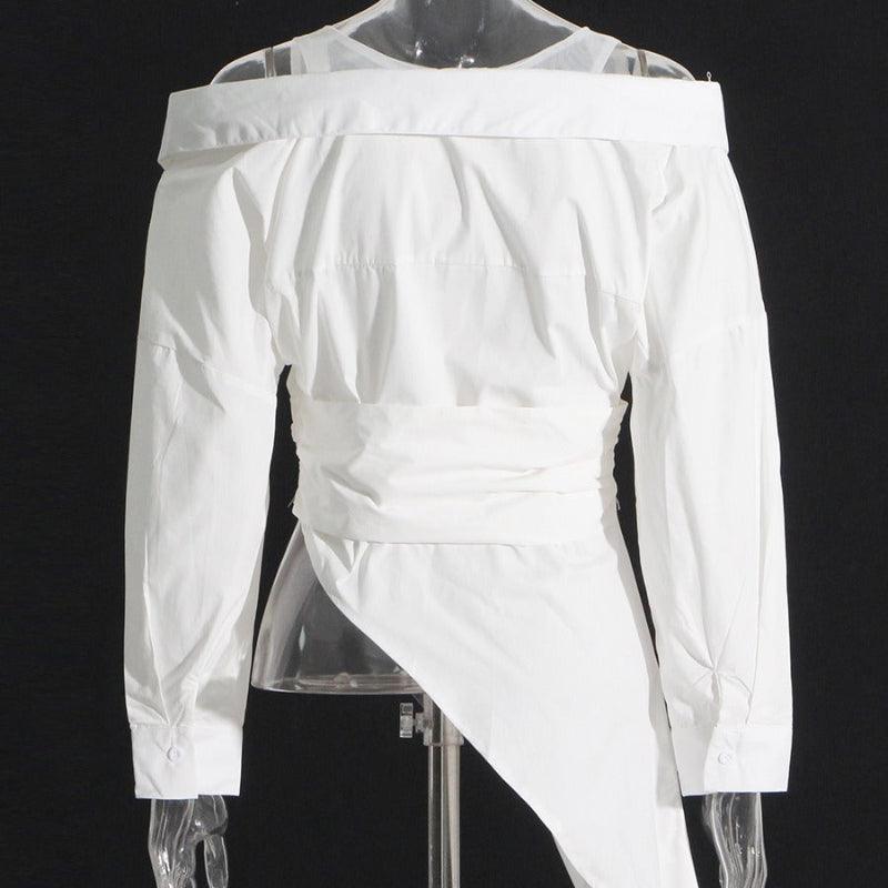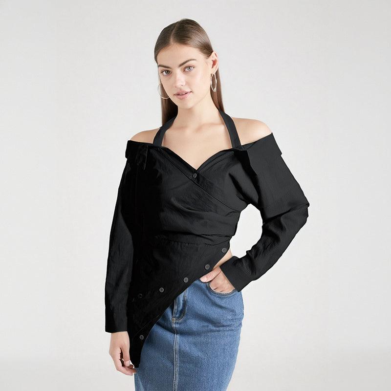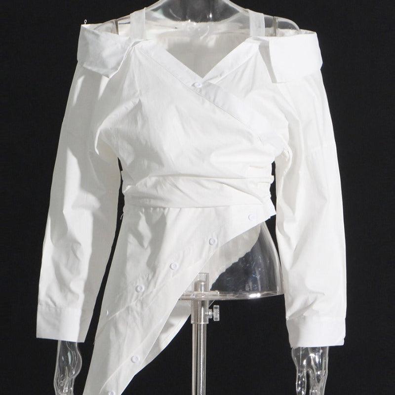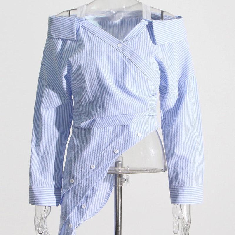 Embrace an effortless elegance with this luxurious Irregular Lapel and Waist Cinching Top. Available in Blue, white, and black, the Sexy Wind style features a unique Color Blocking pattern that is sure to turn heads. Long sleeves and a Flip Collar neckline add sophistication to this premium top. Made from high-quality polyester fiber, it offers a comfortable loose fit, perfect for any casual occasion. And with a convenient Head Cover closure and subtle stripe detailing, this top is both functional and stylish. Elevate your wardrobe and showcase your impeccable taste with this exclusive piece designed for the modern woman.