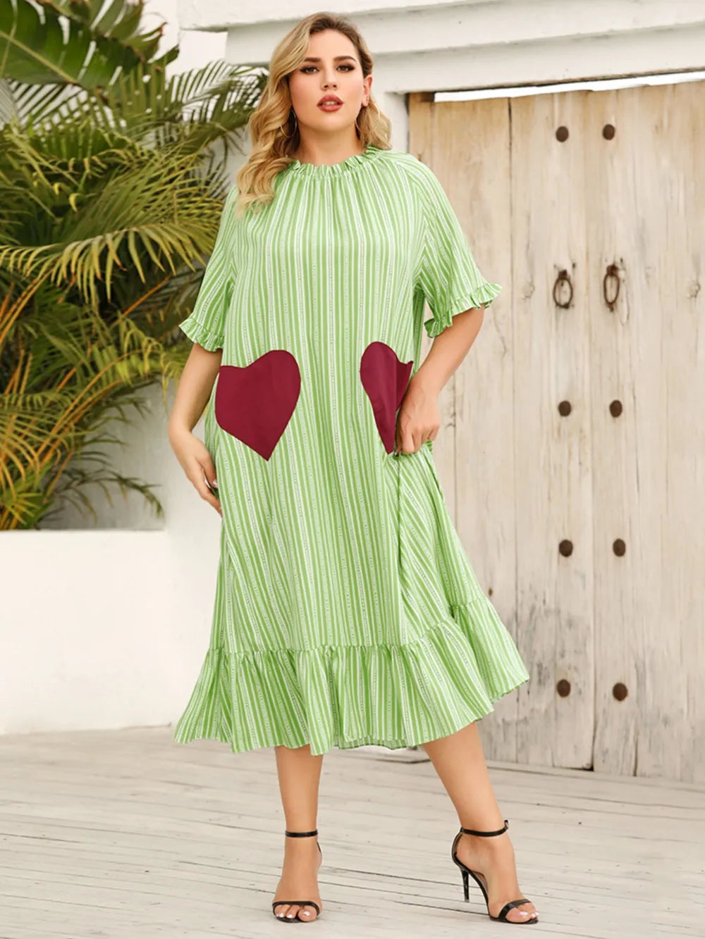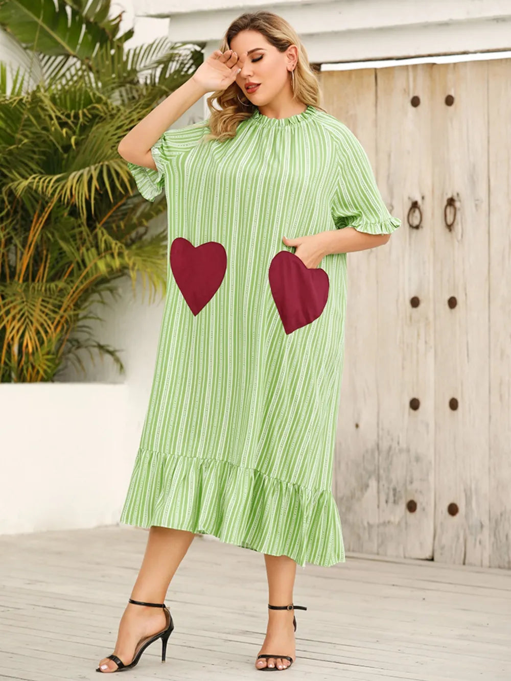 Embrace playful elegance with our Plus Size Frill Heart Striped Half Sleeve Dress in a charming light green. This mid-length dress features a stylish stand collar, delicate frill details, and an eye-catching striped pattern with a heart motif. Made from comfortable polyester with a loose fit and a mid-waist, it's perfect for any casual occasion. Available in sizes 1XL to 4XL. Shop now!