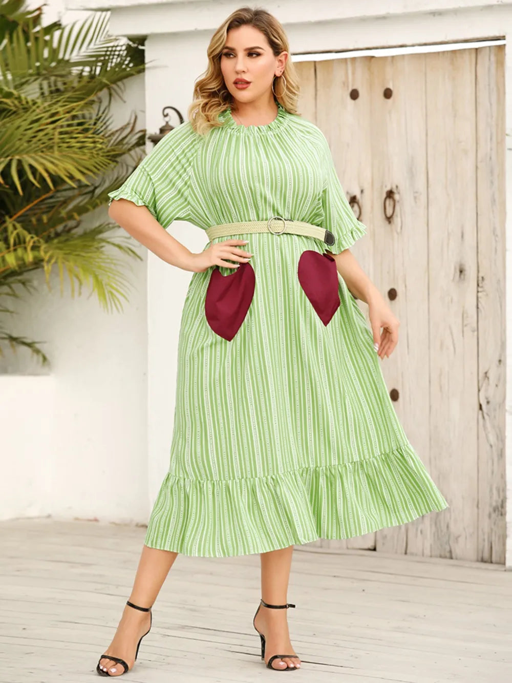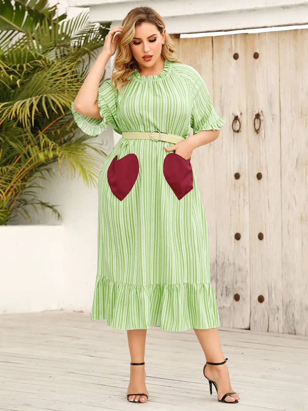 Plus Size Frill Heart Striped Half Sleeve Dress - Light Green