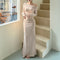 The Deep Apricot color and unique silhouette of this dress call for luxurious accessories. Pair this dress with sleek nude heels to elongate the fishtail design. For added glamour, select a small metallic clutch bag. The one-shoulder design means you can forgo a necklace and focus on elegant drop earrings. Explore a full range of complementing accessories here: Shop Accessories