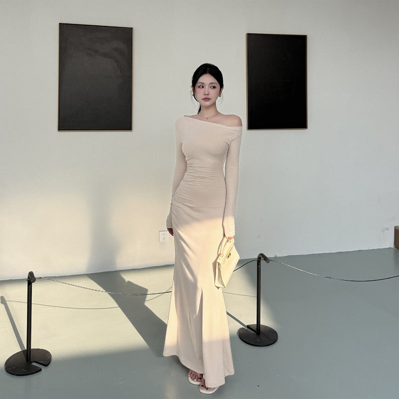 This daring midi dress features an exposed, sophisticated one-shoulder design with a long sleeve and a dramatic fishtail hem. It is pure confidence wrapped in elegant sophistication. The Deep Apricot color is stunning.