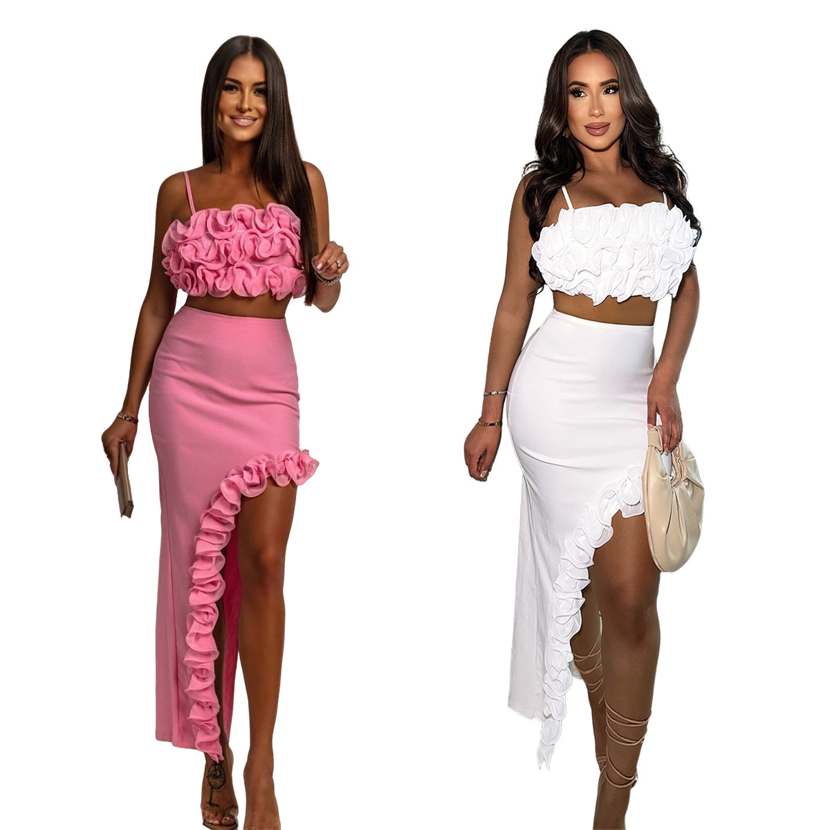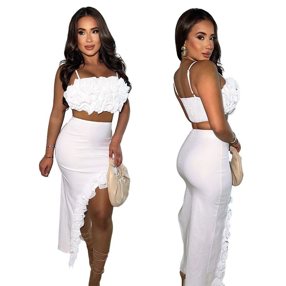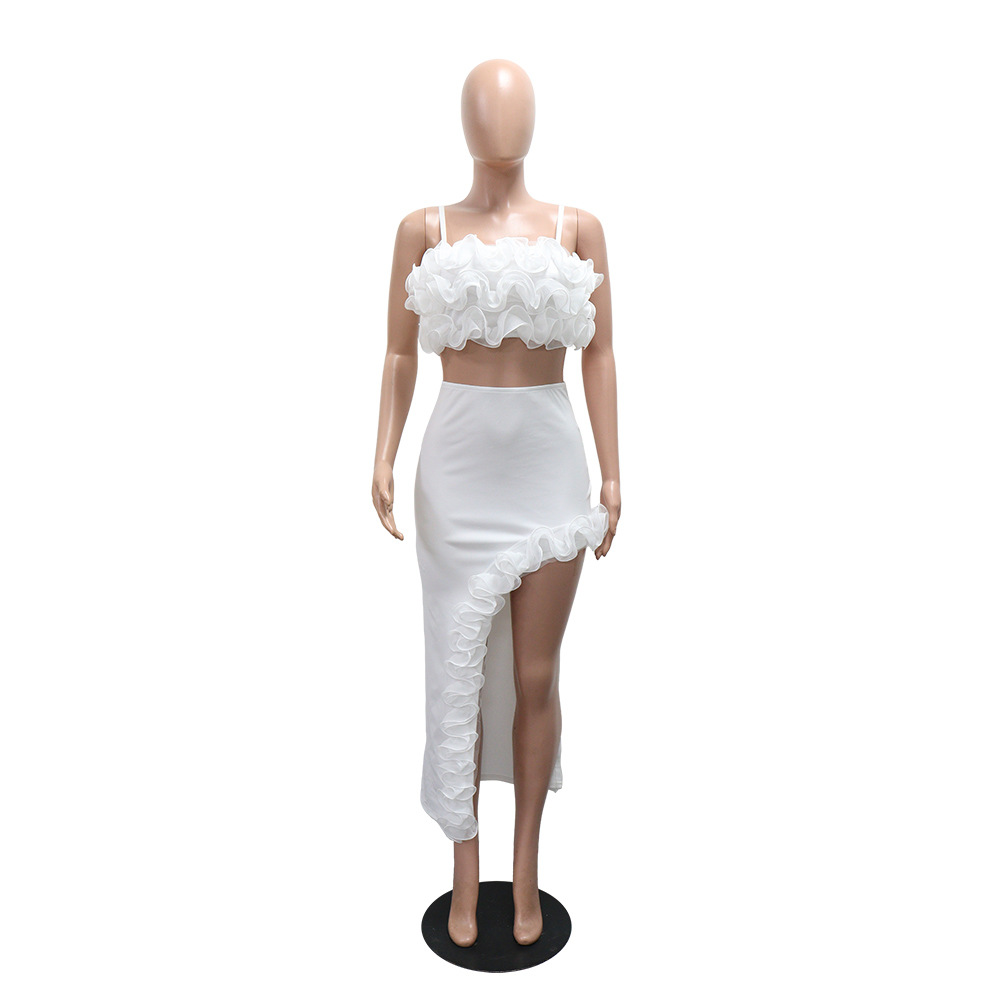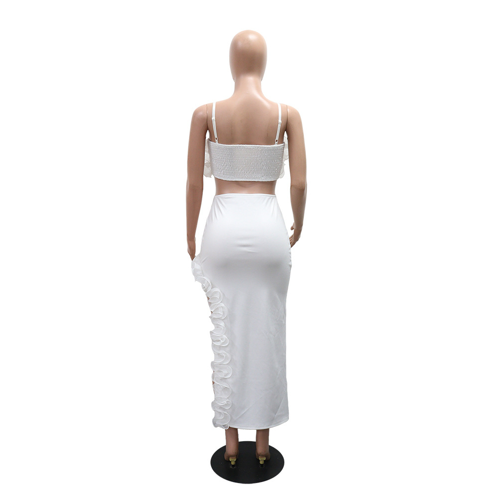 Step out in comfort and style with this versatile Ruffle Hem Skirt with Top Two Piece Set. Featuring a chic sleeveless top and a flowing long skirt with a delicate ruffle hem, this solid-color set is made from a comfortable blend of polyester and spandex. Ideal for casual occasions.